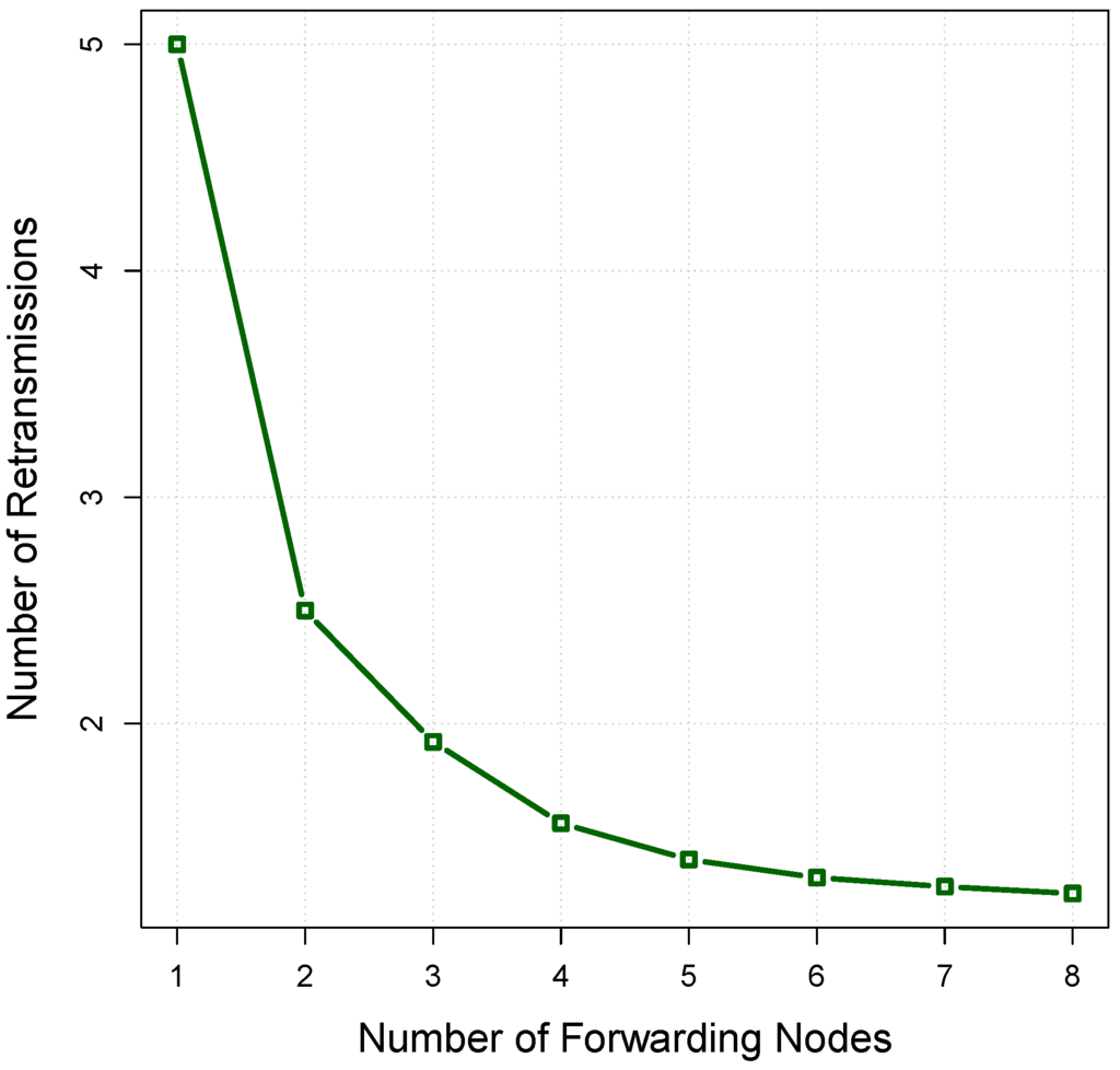 Figure 7, the relationship between the number of forwarding nodes and the number of retransmissions is shown in