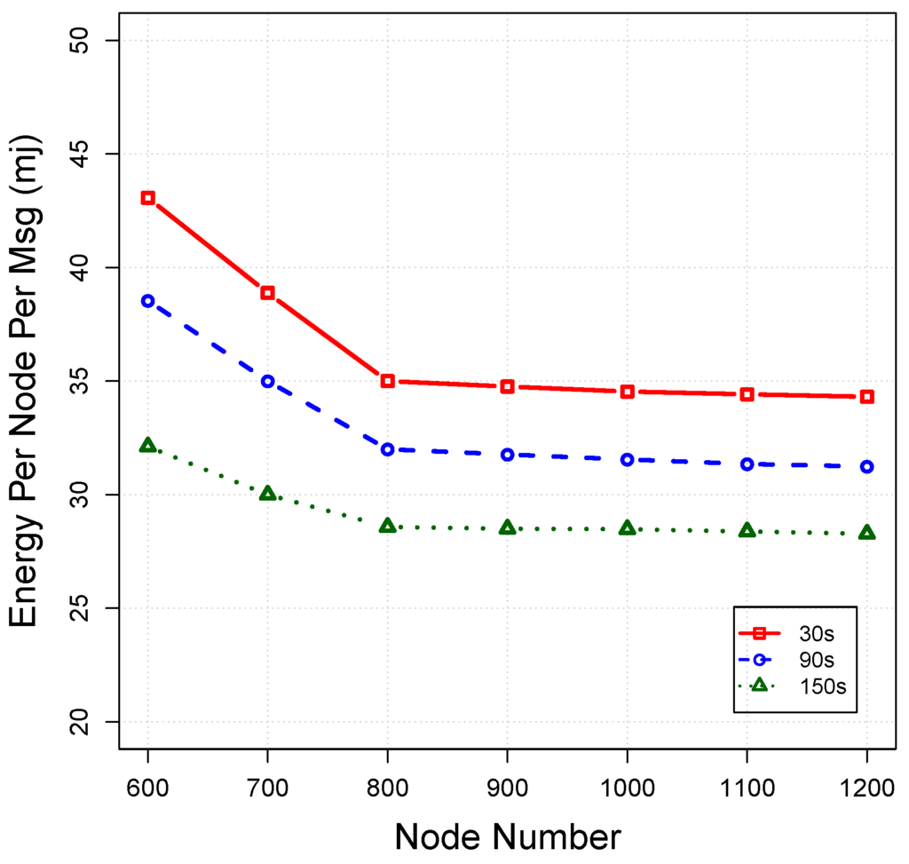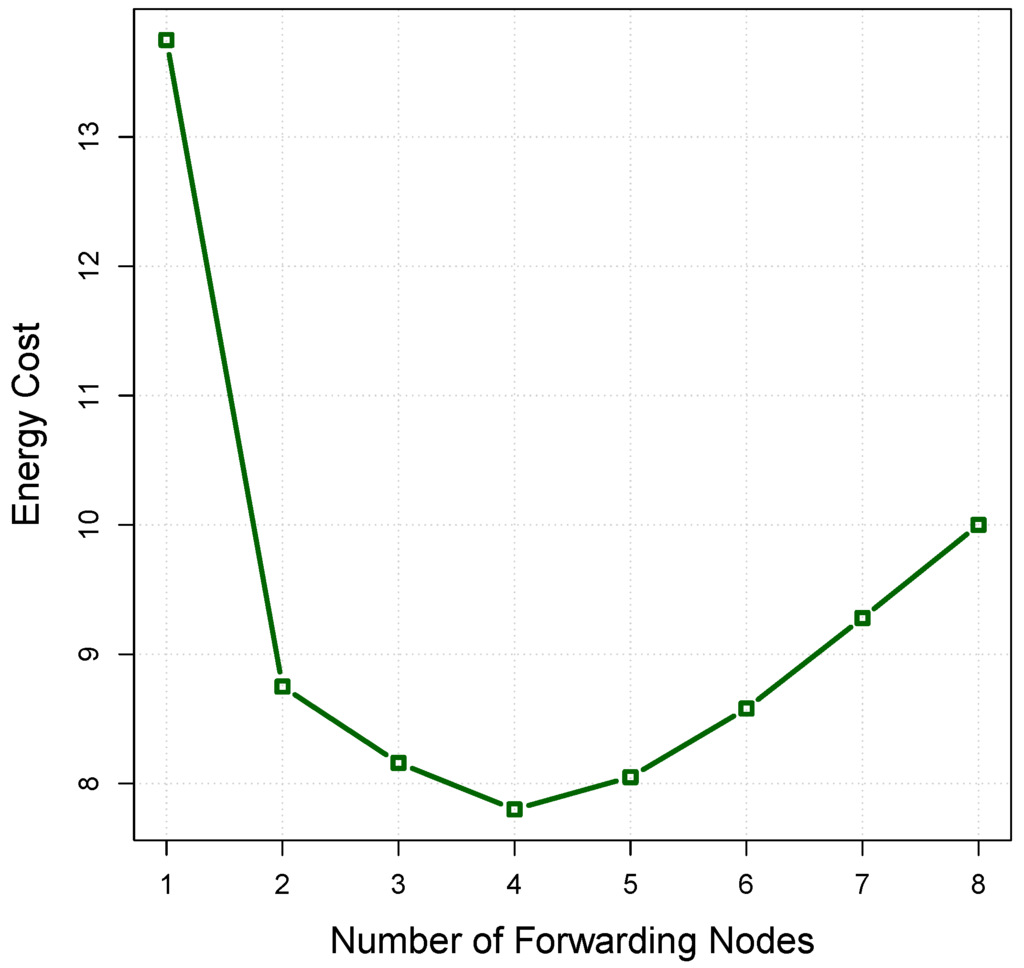 units. It is obvious that the number of forwarding nodes has a vital impact on the energy cost of the set. Lack of sufficient forwarding nodes may increase the number of retransmissions and, subsequently, the energy cost. On the other hand, an excessive number of forwarding nodes can also waste energy. In this example, the energy cost reaches its minimum level, at