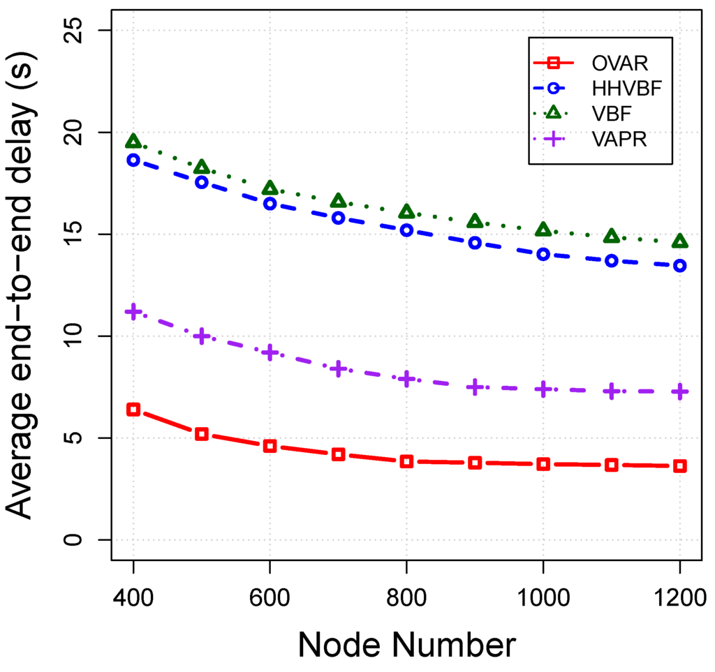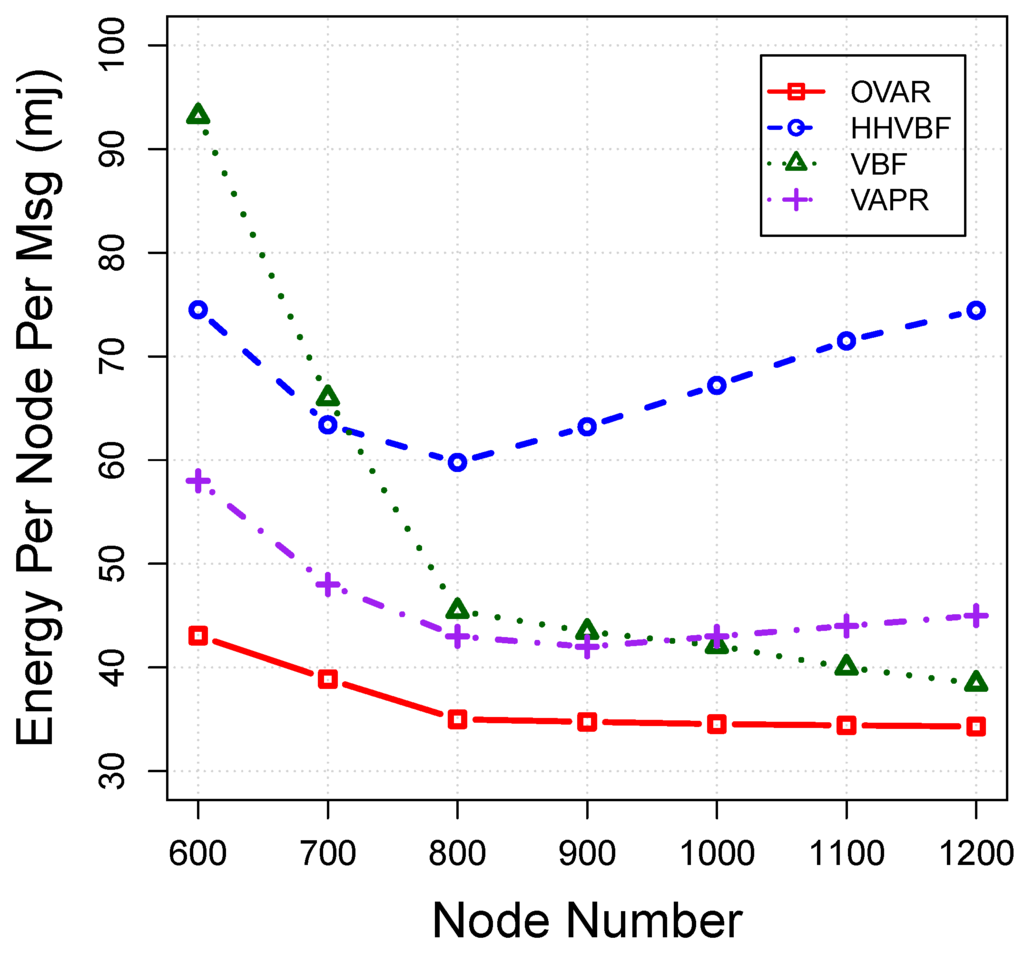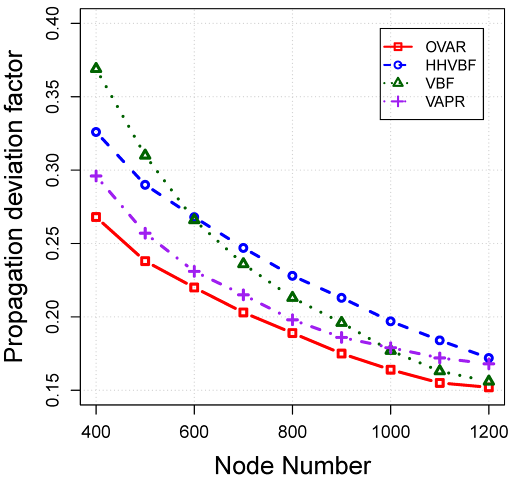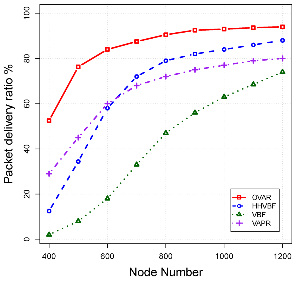 Eventually, node locally selects the forwarding set based on our criteria and broadcasts the packet. Algorithm 5 details the receiving packet procedure at each candidate node. OVAR is a sender-based protocol in which the forwarding node decides which candidate nodes should take part in the packet forwarding. The packet header contains all IDs of members of . The receiver node should be in the forwarding set of the sender to accept the packet; otherwise, it drops the packet. Upon receiving a packet by a forwarding candidate, it sets a forwarding timer proportional to its fitness factor (Equation (7)). Because we adopt the retransmission procedure in OVAR, if a node receives a repetitive packet, it should again set a new holding timer for this packet to be synchronised with other candidate nodes in the forwarding set. A node with the highest priority has the lowest forwarding timer value among forwarding candidates, and if the packet is relayed by this node, other lower priorities candidates should discard the packet after hearing the packet transmission. A low priority candidate can become a forwarding node if all of the nodes in the forwarding set with higher priority failed to receive or relay the packet, which can be recognised by listening to the channel. This procedure with the aid of timer scheduling is repeated until the packet is successfully relayed to the next hop. By using this mechanism, redundant transmissions are prevented, which leads to more energy savings for the whole network.