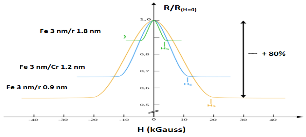 Baibich et al. [13] found that there was a relationship between the thickness of the Cr layer and the temperature. They found that the magnetic resistance decreases as the thickness increases and the properties of antiferromagnetic Cr(AF) in Fe/Cr structure layer is weak, as shown in Figure 2. With the increase of temperature from 4.2 K to room temperature, magnetic resistance and Hs decreased, where Hs is the magnetic field required to overcome the antiferromagnetic properties in the structural layer of Fe/Cr.