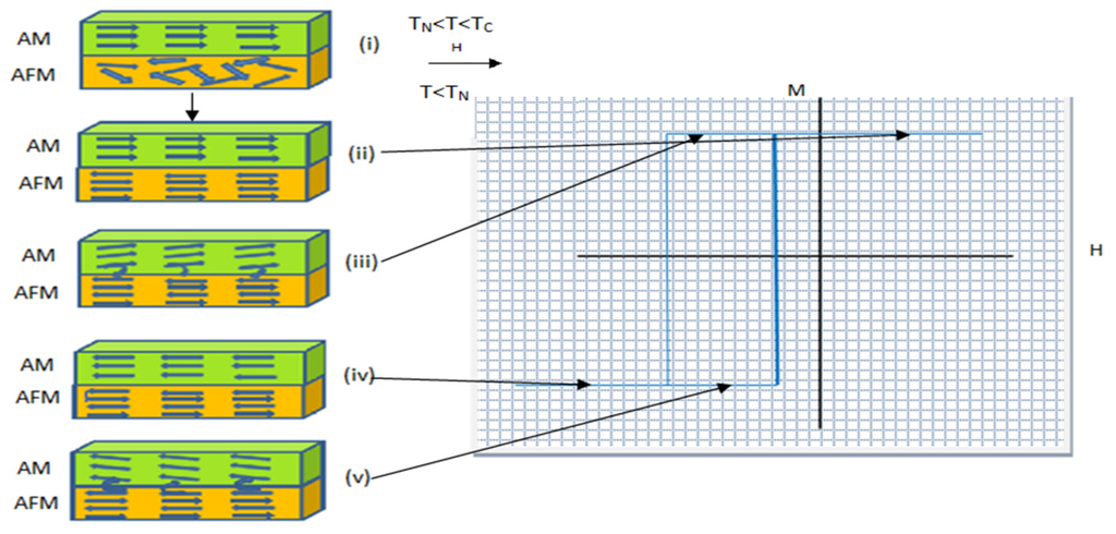 Schematic diagram of the spin valve configuration of FM/AFM (a) at different stages (i) to (v) of an exchange biased hysteresis loop by Nogues et al. [16].