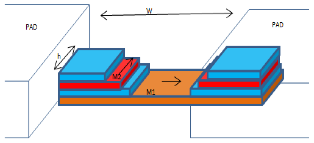 In the mid-1990s, Freitas et al. [17] introduced the linear spin valve sensor design as shown in Figure 4. Length and width of the magnet dimensions are W and h. A material layer of scattered electrons is arranged in a longitudinal orientation. When an excitation magnetic field is applied opposite the spin electrons’ orientation, electron spin in the material will rotate and be parallel to the direction of the applied magnetic field. The scattering angle rotation of electron spins is dependent on the position of electron spins along the surface layer material.