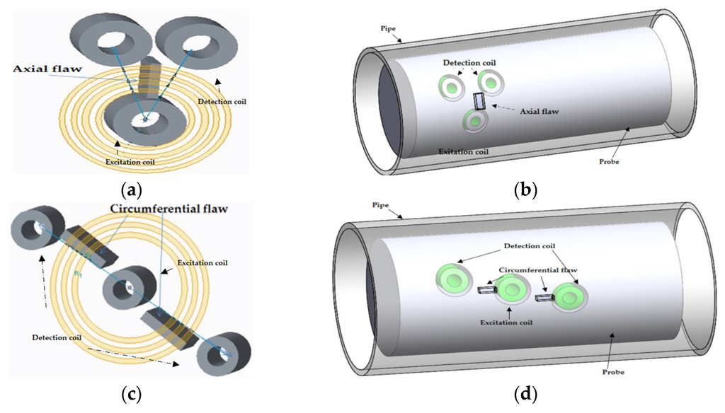 Axial and circumferential channels of array probe: (a) Axial channel configuration; (b) illustration of the axial channel excitation and detection coil location on the eddy current testing probe (c) circumferential channel configuration; (d) illustration of the circumferential channel excitation and detection coil location on the eddy current testing probe.