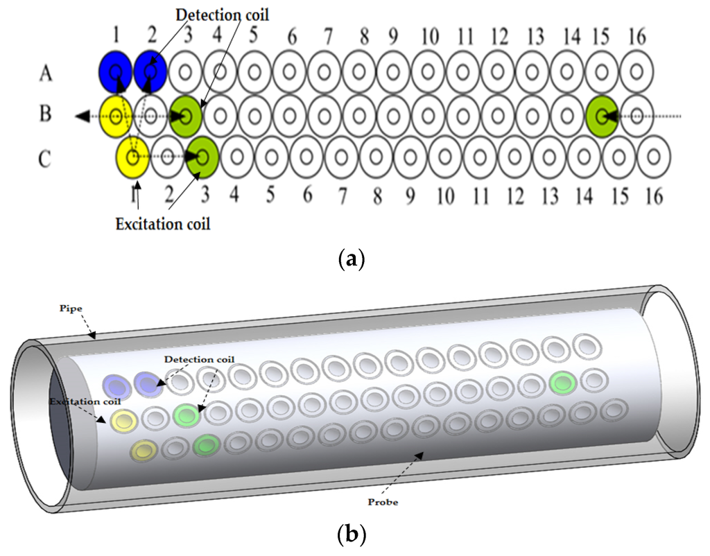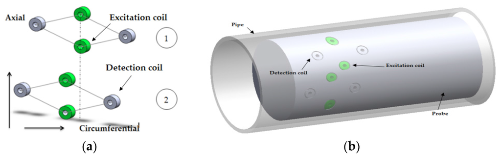 Axial and circumferential channels of array probes: (a) Excitation and detection coil configuration; (b) illustration of the excitation and detection coil location on the eddy current testing probe for an array probe.