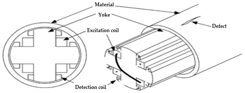 Two type of probe designs are used for flat plate inspection, where iron cores are replaced by two ferromagnetic yokes. Two pairs of excitation coils and the search coils are both wound on the yoke as represent in the figure. A modified design of the probe renders it possible to inspect a tube with the same principle as shown in Figure 10. However, this type of sensor is only applicable for ferromagnetic materials, since it needs a return path for the magnetic flux [41,42].