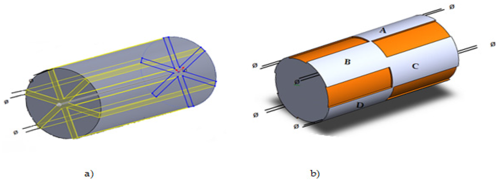An inner eddy current transducer with the rotating magnetic field is also proposed by Grimberg for tube inspection, as shown in Figure 12a,b. The excitation coils are three rectangular windings with the same turn numbers and placed 120 degrees spatially apart. These windings are then excited by three phase balanced sinusoidal alternating currents. Thus, a rotating magnetic field is generated by these three windings. The detection coils are eight flat coils placed on the external surface of the probe cylinder and connected to a multi-channel eddy current control equipment. For tube inspection the probe is pushed and pulled by a computer controlled system [44,45].