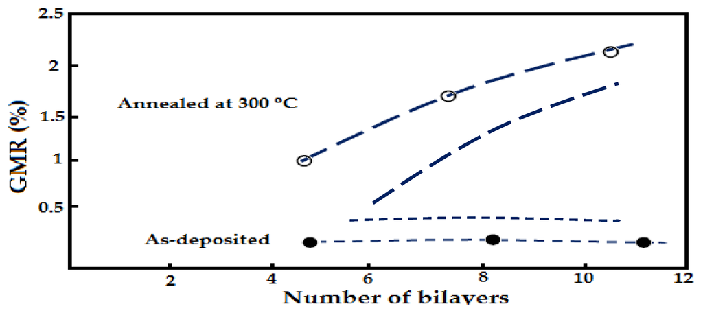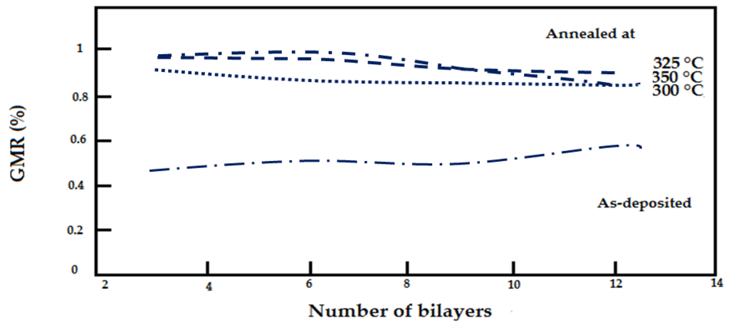- Hossain, A.; Pirkle, H.; Parker, R. Design and fabrication of GMR multilayers with enhanced thermal stability. J. Magn. Magn. Mater. 1996, 156, 303–305. [Google Scholar] [CrossRef]