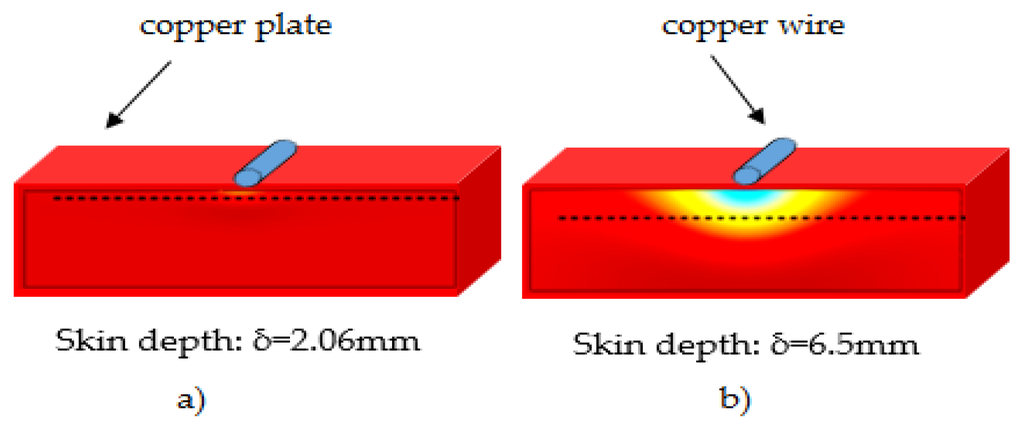The novel state of the art non-destructive testing eddy current techniques are derived from electromagnetic principles. The techniques are based on a non-uniform magnetic field induced in the conductive material due to the presence of defects to determine the profile of a defect in the material being inspected [6,7,8]. Various material profiles can be obtained by using different exciting current frequencies. The magnetic field changes may provide information related to any defects inherent in the material, electrical conductivity and permeability of the material after a heat treatment process, surface and subsurface defects. This discovery is the starting point for research on non-destructive testing using the eddy current principle.