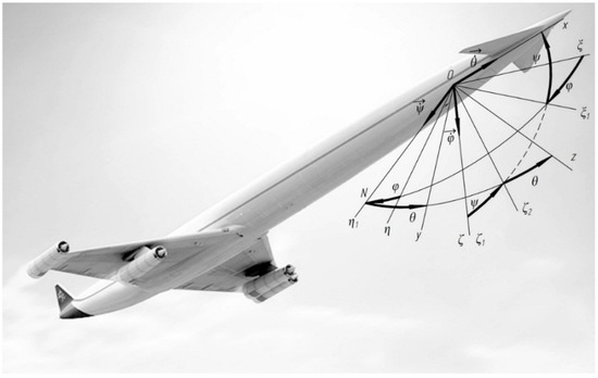 Specify the position of the axes associated with the aircraft by Euler angles (Figure 4). As the reference coordinate system O ξ η ζ select three axes, connected, for example, with the Earth. Then, the projections of the angular velocity on the axis Ox1y1z1 and on the axis Oxyz will be determined by the ratio: