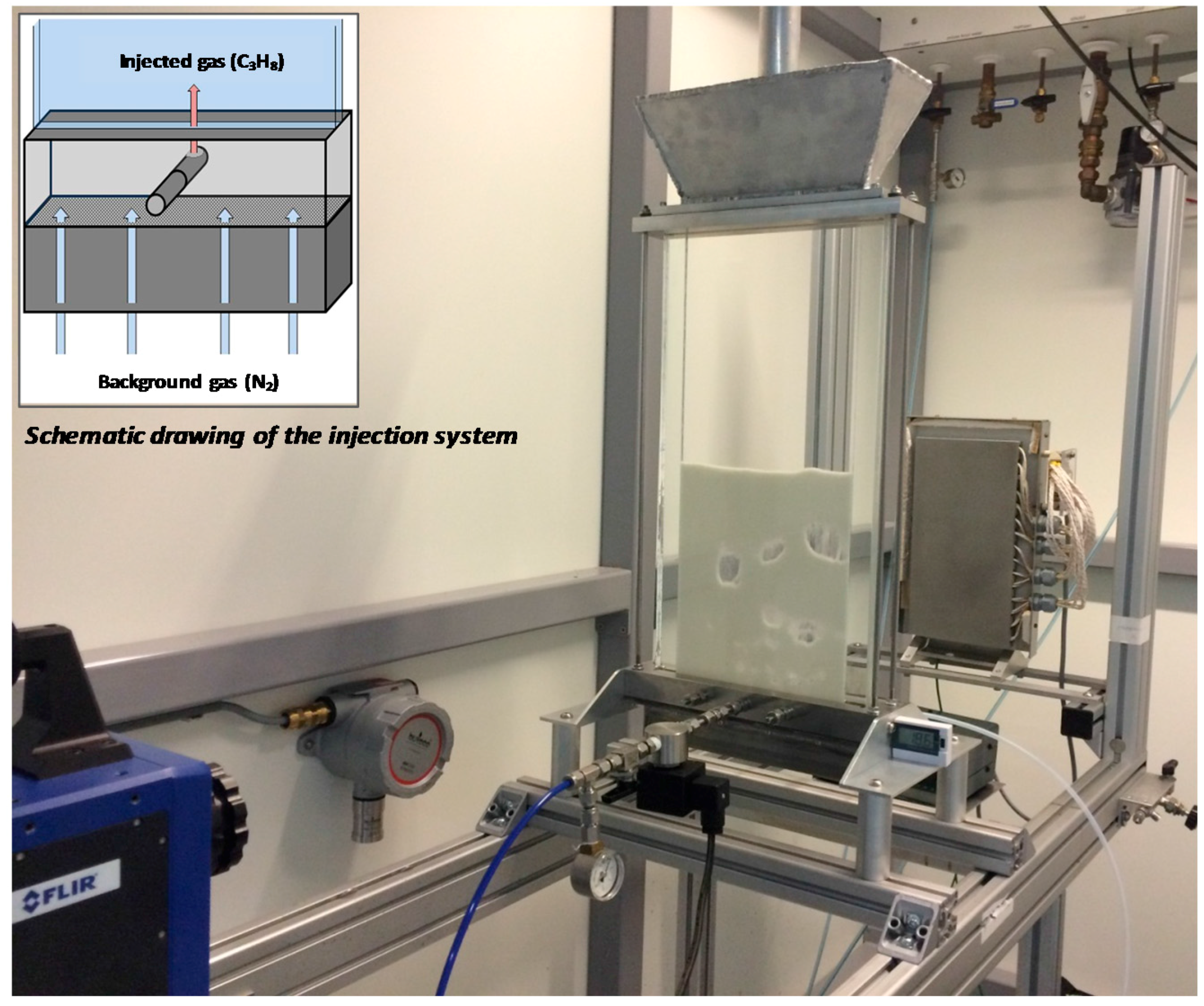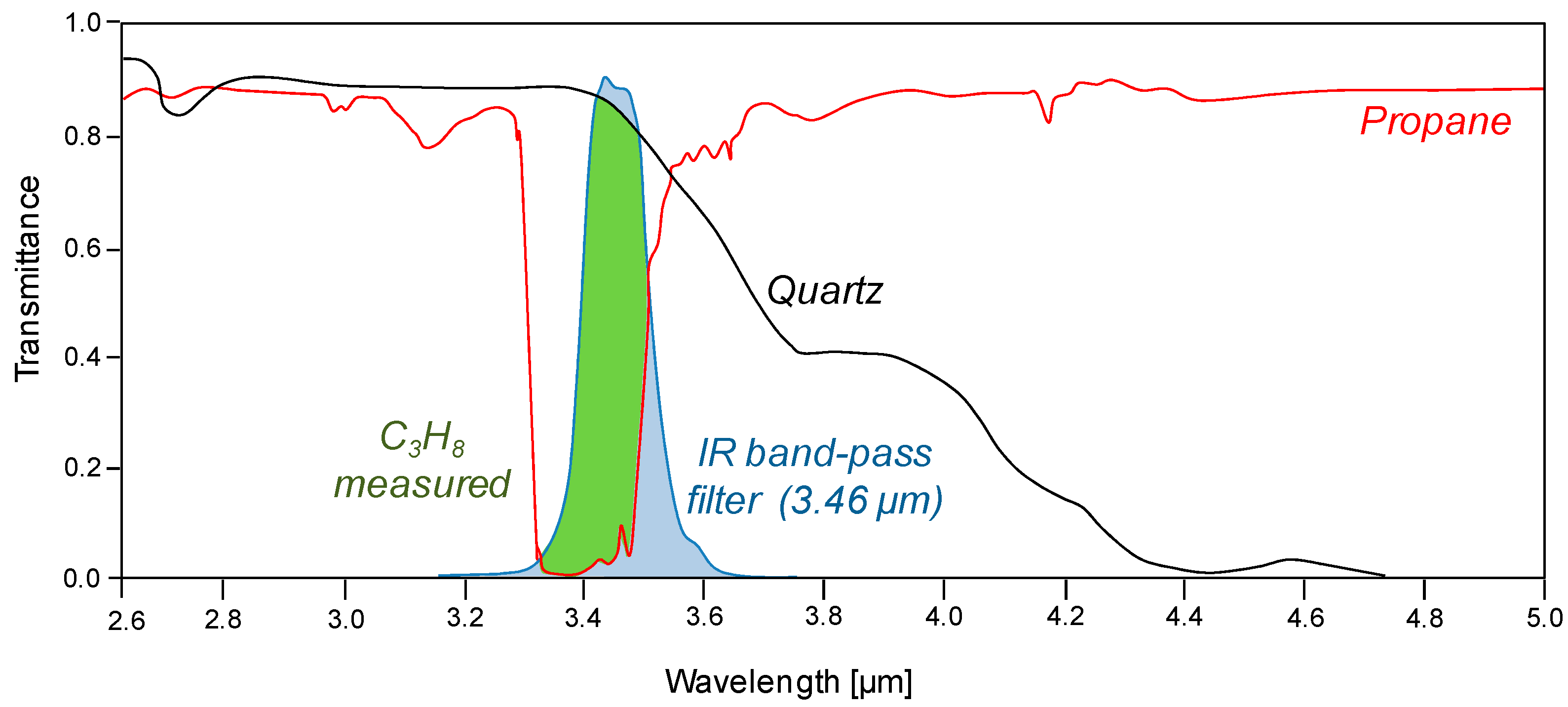For the system based on a quartz column and propane as tracer gas, a band-pass filter is required in order to limit the range in the IR spectrum in which the camera detects IR radiation. A representation of the IR absorbance using this system is given in Figure 2. A more detailed description on the whole system is given in the next section.