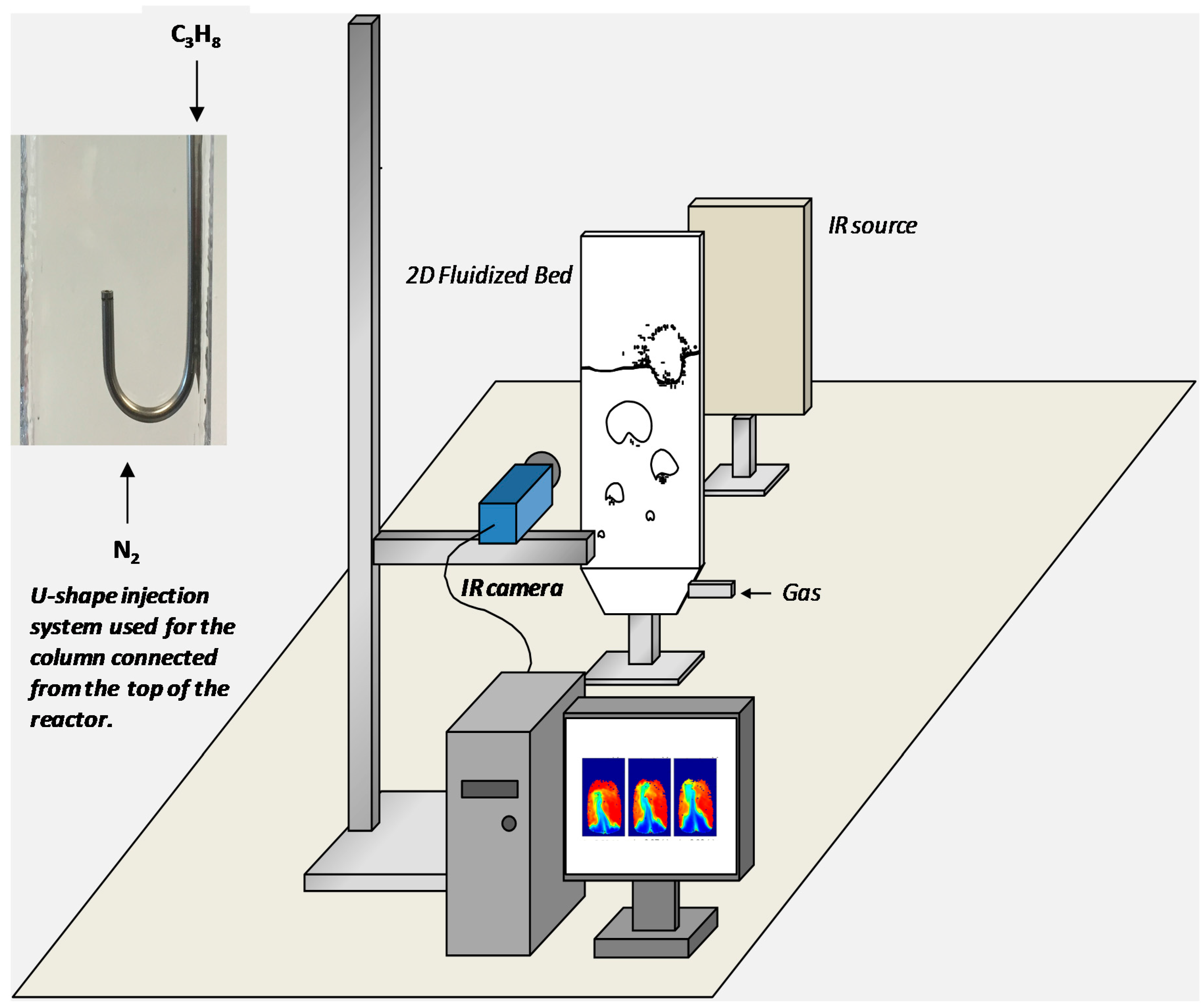 Between the IR source and the detector, the quartz column is positioned. One of the main restrictions of the optical technique is the fact that only pseudo-2D columns can be used in order to ensure that all IR emission passes virtually perpendicularly through the column and is not reflected/refracted, which would imply a decrease in the measured intensity. The use of quartz as column material makes it much easier to apply the technique for many different applications, since different sizes and configurations can be easily constructed while a high transmission in the desired wavelength range is always achieved. As a reference case for the development of the technique, a pseudo-2D quartz column with 300, 80 and 8 mm in height, width and depth, respectively, has been built using two quartz plates with a wall thickness of 6 mm. The column, as depicted in Figure 3, is settled in a stainless steel frame which provides the required stability for the measurements. The bottom part of the quartz column is connected to a quartz porous plate distributor of 40 μm pore size and 3 mm thickness. Propane can be either fed through the distributor at the bottom of the column or in a selective way through an injector connected from the top of the column. The injector is a 3 mm stainless steel tube connected to the top of the reactor and ending in a U-shape with the injection point covered by a 100 μm wire mess for a better gas distribution and to avoid particles entering the tube. This column has only been used for the optimization of all the variables involved in the technique.