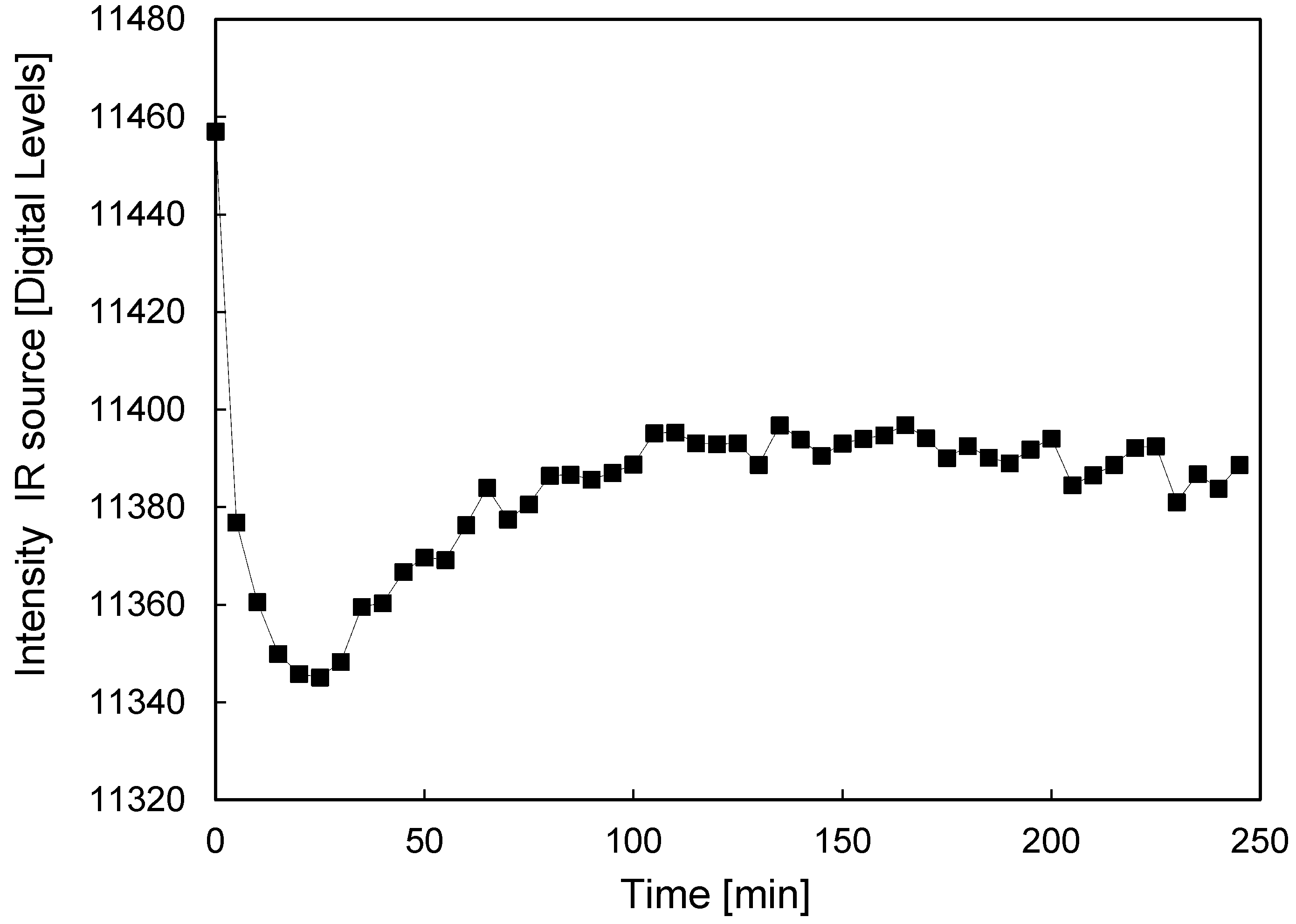 Variation of measured IR intensity as a function of time in an empty quartz column fed with N2 once the IR source has reached the target set point (430 °C).