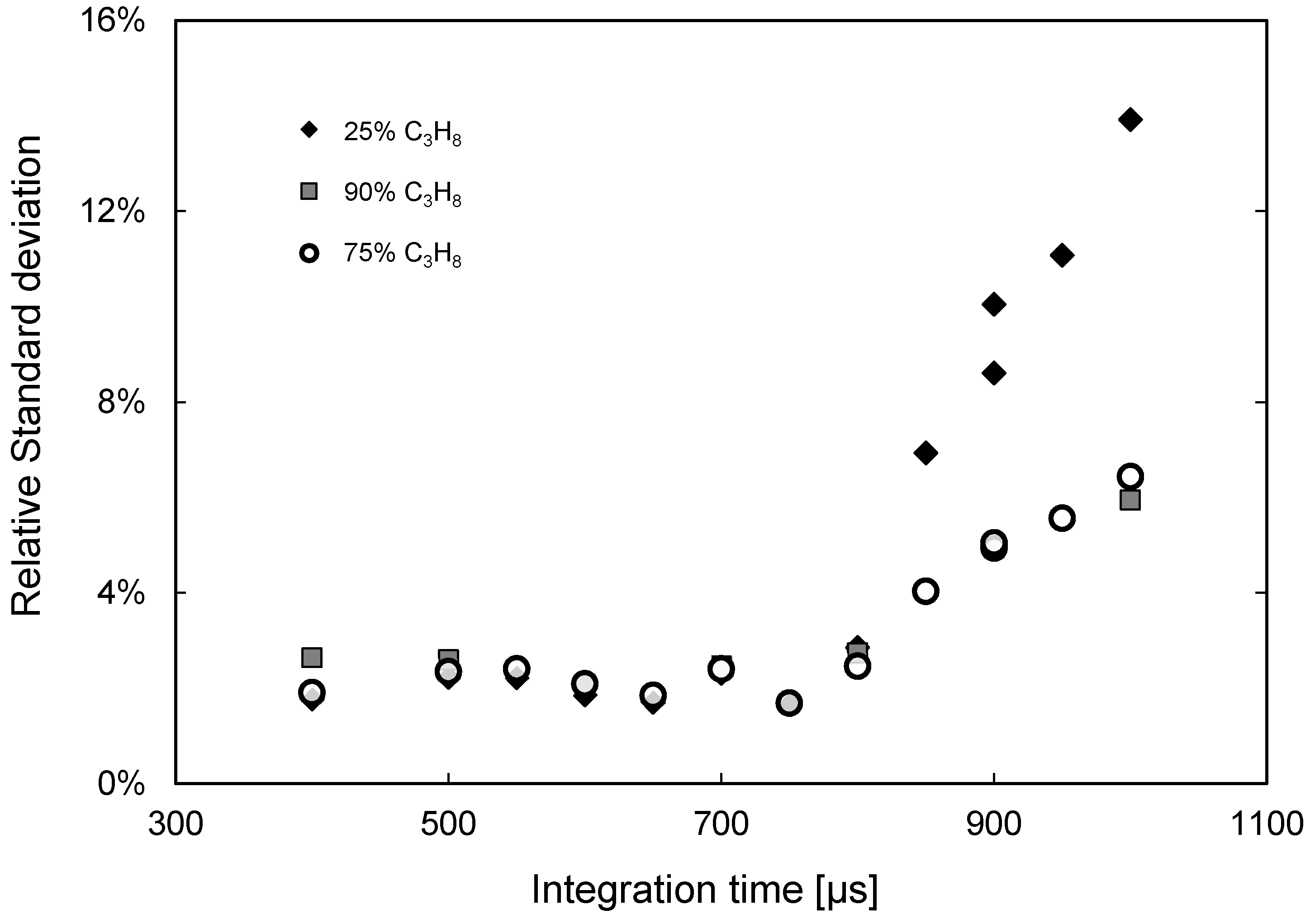 Influence of the camera integration time on the quality of the measurements in relative standard deviation of the measured intensities in the entire image for different C3H8 concentrations.
