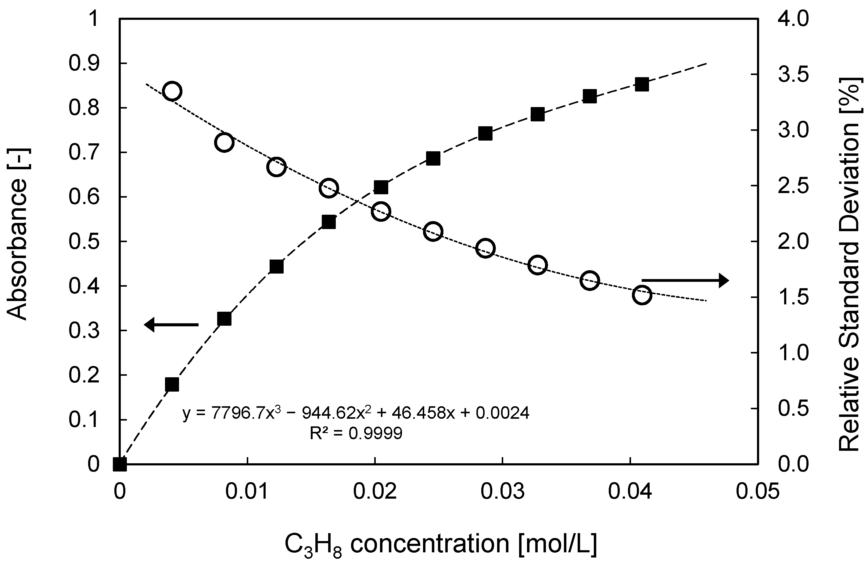 The calibration measurements have been carried out taking an average background intensity (I0) of the quartz column fed only with N2 of 500 images taken with a frame rate of 50 Hz in order to obtain a representative background image, correcting for small spatial inhomogeneities in the IR emission radiation, and minimizing influences of fluctuations observed in the IR emission and assuring steady state operation (see Figure 5). This background image is used for the determination of the absorbances for different gas mixtures. In total 1000 images at 50 Hz have been taken for any tracer gas mixture composition. As depicted in Figure 7, the propane concentration can be well-correlated using a third order polynomial as a function of the absorbance. The calibration curve shows a linear profile for only very low concentrations, as described by Lambert Beer’s law, whereas it deviates from linearity for higher concentrations attributed to the restriction of movement of the bonds decreasing the extent of absorption. In addition, the absorbance of every single image out of the 1000 images taken for each gas composition has been calculated, with which the standard deviation over all images was determined. This deviation is representative of the maximum standard deviation of the technique and, as also shown in Figure 7, it is quite low. The highest standard deviation is for the lowest tracer gas concentration, but, in any case, lower than about 3%. It should be noted that this error is in the same range as the errors of the mass flow controllers at these low flow rates.