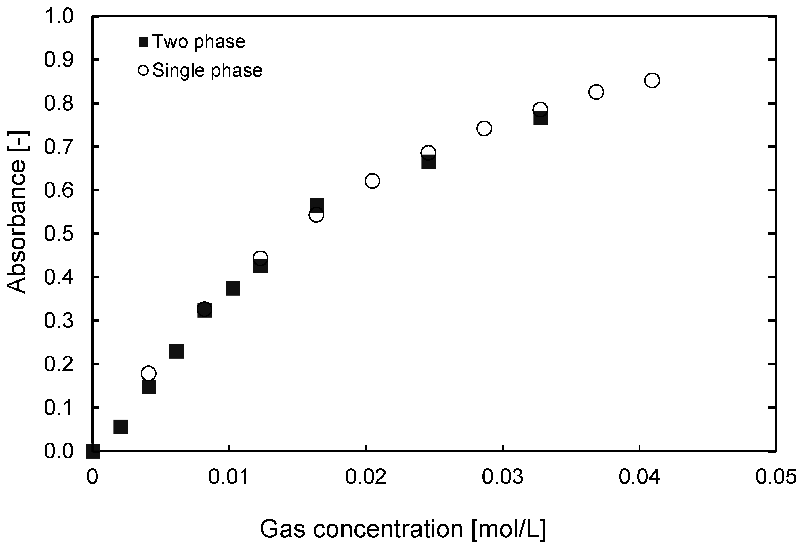 Comparison between the calibration curve of tracer gas concentrations obtained in the empty column and the two phase system using a composed background image.