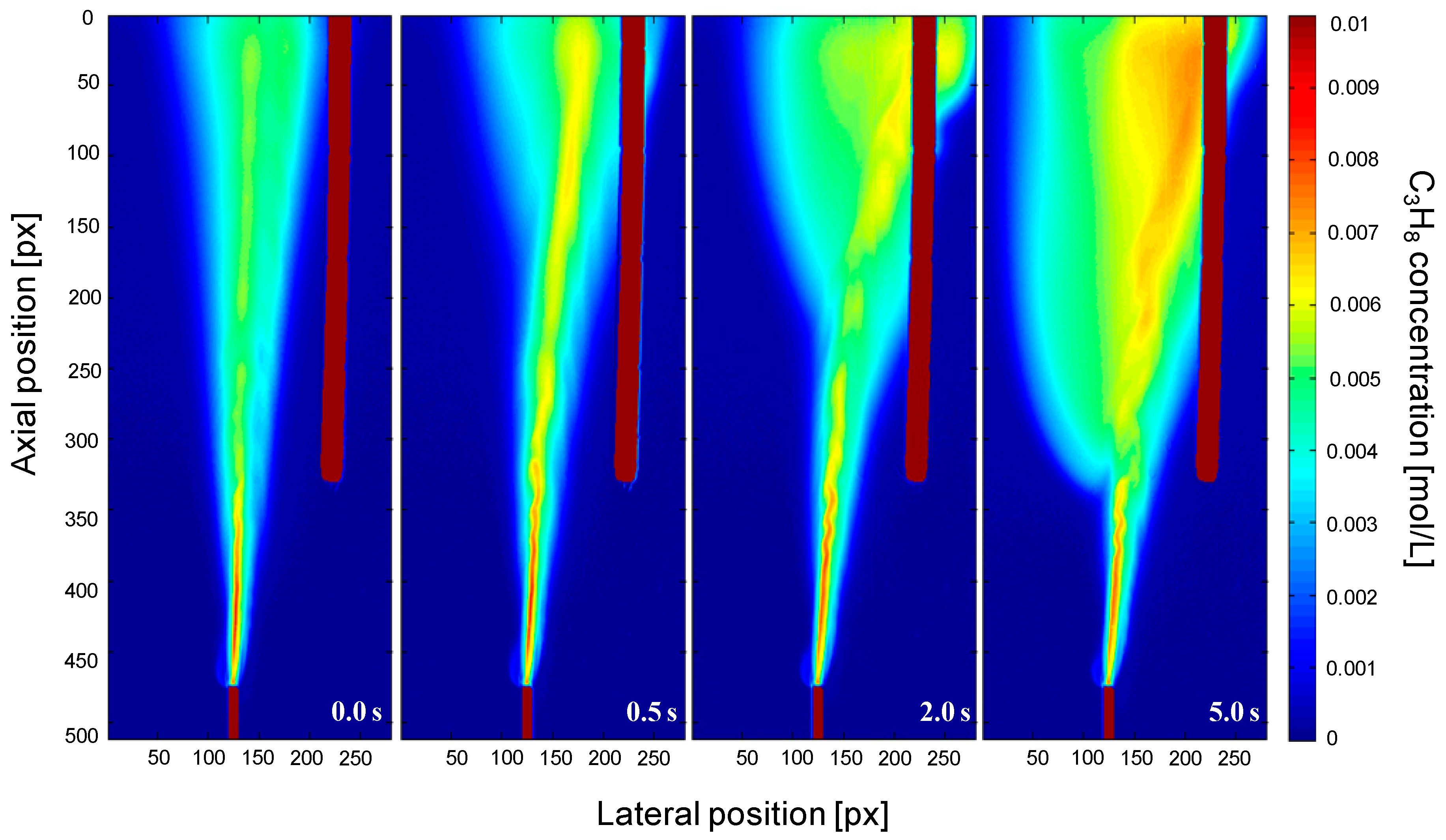 In Figure 9 a case of 10% gas extraction through the porous membrane is presented at different moments in time after the vacuum at the permeate side has been imposed. In the left part of the figure, the gas extraction system was not connected and thus the C3H8 rises through the bed showing dispersion of the jet, as usual in the laminar flow regime. Once the vacuum pump is connected, a driving force for gas extraction via the membrane is created, causing bending of the flow towards the membrane. This effect becomes even more pronounced for longer times after turning on the vacuum pump. Most of the gas that is extracted through the membrane is coming from the N2 background gas, thus increasing the C3H8 concentration, as can be clearly observed in the most right-hand figure. However, it is important to note that the observed increase in concentration was not caused by differences in perm-selectivity of the membrane for C3H8 and N2; however, this test experiment has indicated that the developed technique may be used to visualize and quantify concentration polarization effects in membrane separators and reactors.