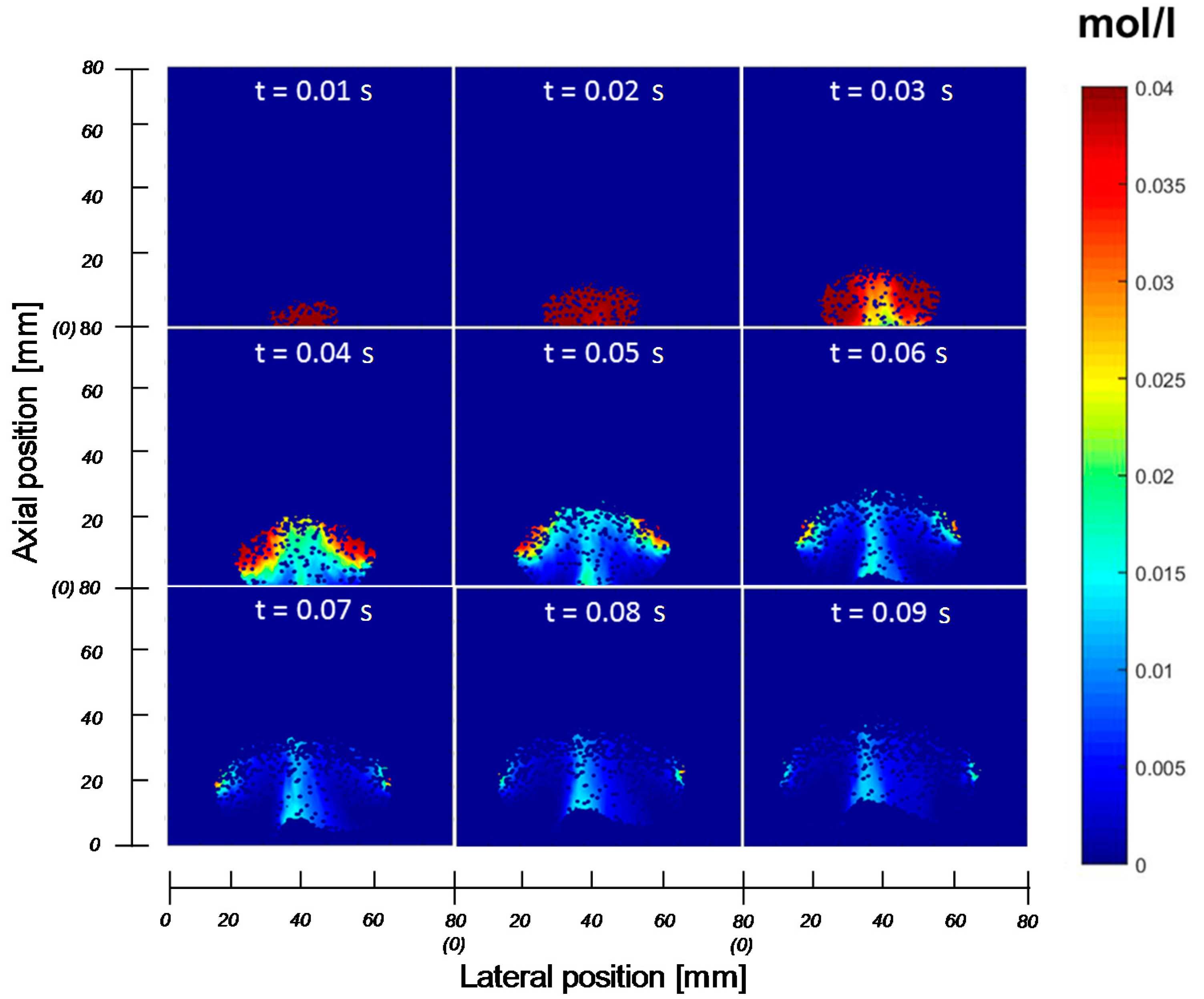The novel developed technique is used in this section for the study of the bubble-to-emulsion phase mass exchange coefficient for single injected bubbles. The tracer gas is injected in controlled volumes via a single orifice above the distributor plate, while the bed is initially at incipient fluidization conditions in absence of tracer gas. The injected tracer gas will form a bubble containing the tracer gas and snapshots of the tracer concentration profiles inside the bubble at different moments in time after bubble detachment can be analysed, where the variation of the total tracer gas concentration in the bubble in time is used to determine the mass transfer coefficient. In Figure 10 the generation and propagation of an injected bubble into a fluidized bed at incipient fluidization conditions consisting of glass beads with a particle size ranging from 0.62 to 0.72 mm at different moments in time is shown.