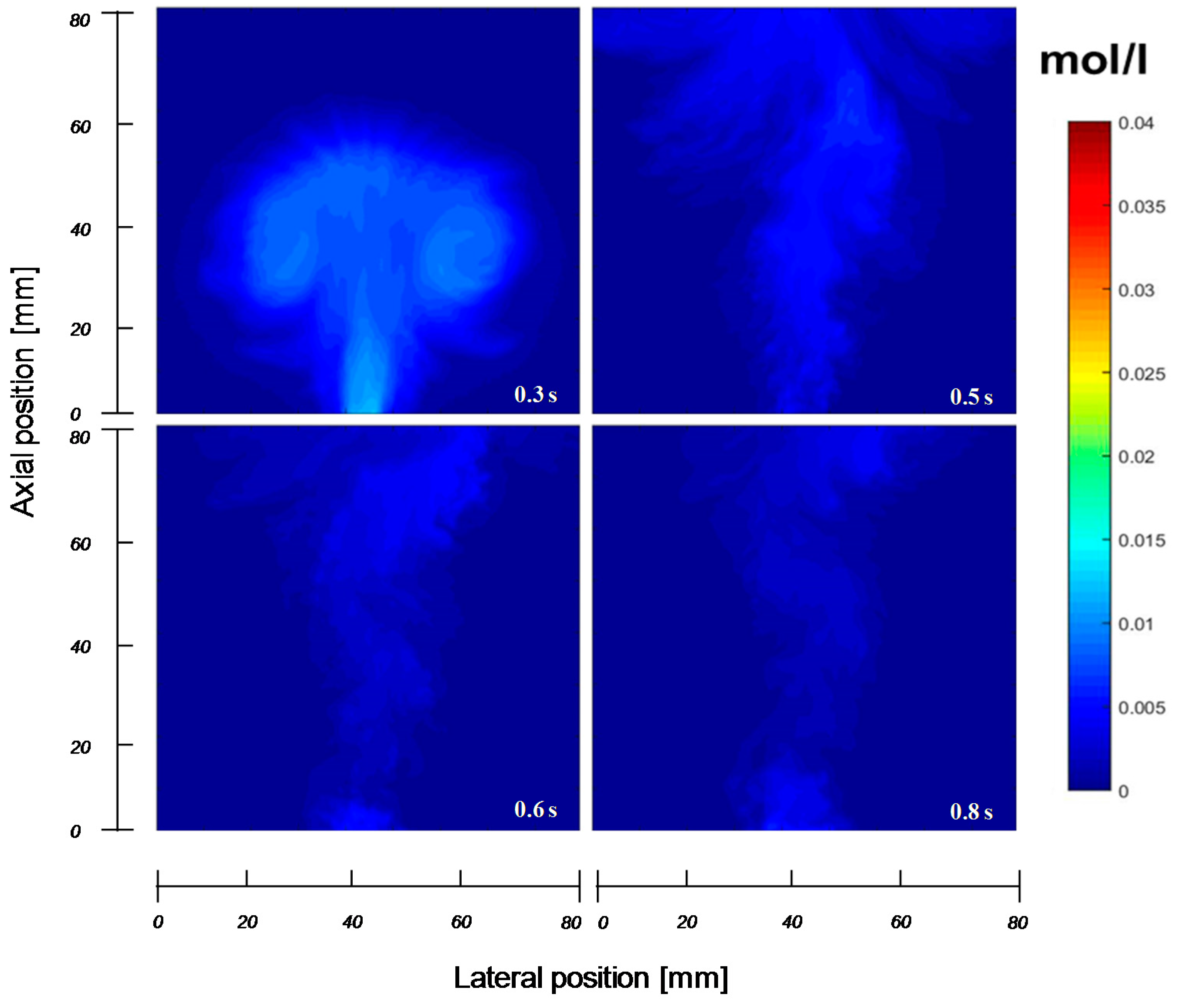 30]. The fact that a uniform concentration is suggested inside the bubble is also related to the difficulties in obtaining proper whole-field measurements of the gas concentration in fluidized beds. Experimental measurements of mass transfer rates between the bubble and emulsion phases have normally been carried out using invasive techniques consisting of local measurements of a gas tracer injected into an incipient fluidized bed [