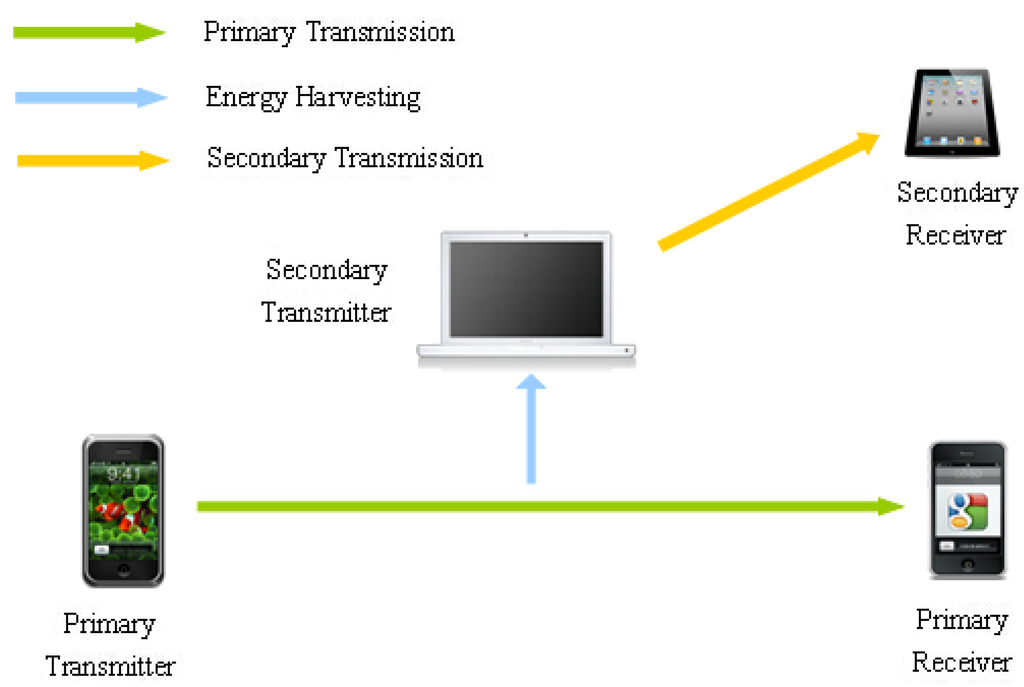 In recent years, the problem about energy consumption has become increasingly severe; this urgently calls for solutions to improve energy efficiency [7]. Apart from energy-efficient wireless communication technologies, energy harvesting communication systems powered either largely or exclusively by renewable sources are regarded as another useful alternative that can efficiently relieve energy-deficiency and have become more attractive [8]. Compared to traditional battery-powered communication systems, energy harvesting could potentially provide infinite energy supply from the environment in a much easier and safer way for conventional energy-constrained wireless communication systems, such as wireless sensor networks (WSNs). Pappas et al. studied the maximum stable throughput region for a simple cognitive radio network when the primary transmitter harvests ambient energy but the secondary transmitter is plugged into a reliable power supply [9]. Lee et al. analyzed the transmission probability of secondary transmitters and the resulting spatial throughput of the secondary network when the secondary transmitters harvest ambient RF energy from transmissions by nearby active primary transmitters, while opportunistically accessing the spectrum licensed to the primary network [10]. Energy harvesting is also regarded as a promising approach for powering relay node [11,12,13,14,15]. In [11], the authors derived the optimal switching rule between the information decoding mode and the energy harvesting mode to minimize the outage probability. In [12], the authors formulated the optimal sensing and access policies as a Markov decision process and derived the optimal policy by the probability of PU’s presence and the amount of stored energy. In [13], the authors considered a cognitive radio sensor network powered by RF energy harvesting and formulated the optimal mode selection (“access” or “harvest”) policy as a partially observable Markov decision process (POMDP). In [15], spatial spectrum reused in CR networks with energy harvesting was investigated based on a stochastic-geometry model where the primary and secondary transmitters are modeled as independent homogeneous Poisson point processes (HPPPs). In [14], the authors provided an optimal spectrum sensing policy for an energy-harvesting CR that can maximize the expected total throughput under energy causality and collision constraints.