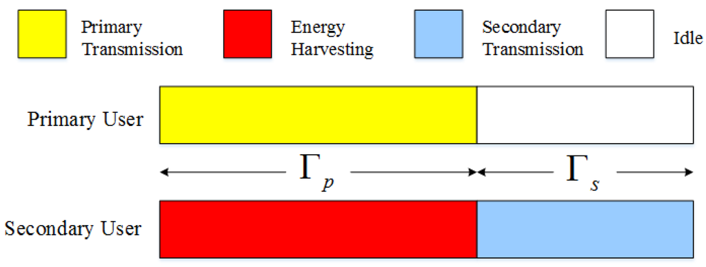(1) During time interval , primary user accesses channel to transmit its data, in the meantime, the SU harvests energy from ambient signal. SU’s harvested energy amounts to , where X denotes SU’s energy harvesting rate (average energy harvested in unit time). Meanwhile, the PU completes data transmitting, where .
