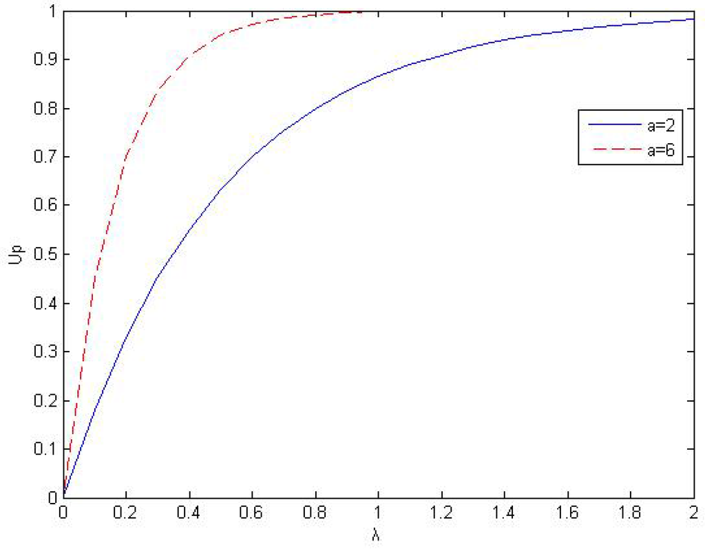 where α is the satisfactory factor of the PU, λ is the achieved capacity versus its reference capacity, referring to the proportional fairness of resource allocation, which is defined as , where is the achieved capacity of the PU, Q is the traffic demand of PU, is the data rate achieved by primary network transmission, Figure 3 shows the curves of the rate satisfactory function versus the λ with different α. In a word, when the transmission rate increases, the satisfactory function value rapidly reaches an asymptotic value. The greater satisfactory factor, the faster growth of satisfactory function value. It is shown that there is a diminishing marginal rate of satisfactory improvement as capacity increases, which follows the law of the diminishing marginal benefit in economics [4].