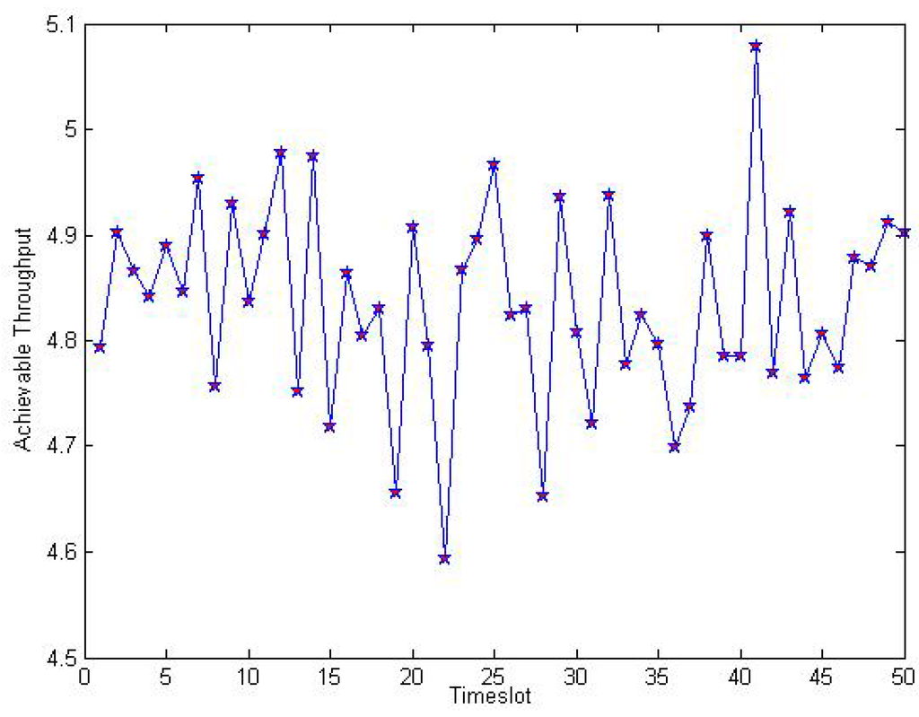 Figure 7 illustrates achievable throughput trace with with respect to the different timeslot in the dynamic spectrum leasing scheme. Due to the randomness of energy harvesting rate, it has a great impact on , so the achievable throughput fluctuates randomly, but its value keeps within a level around constant value 4.8.