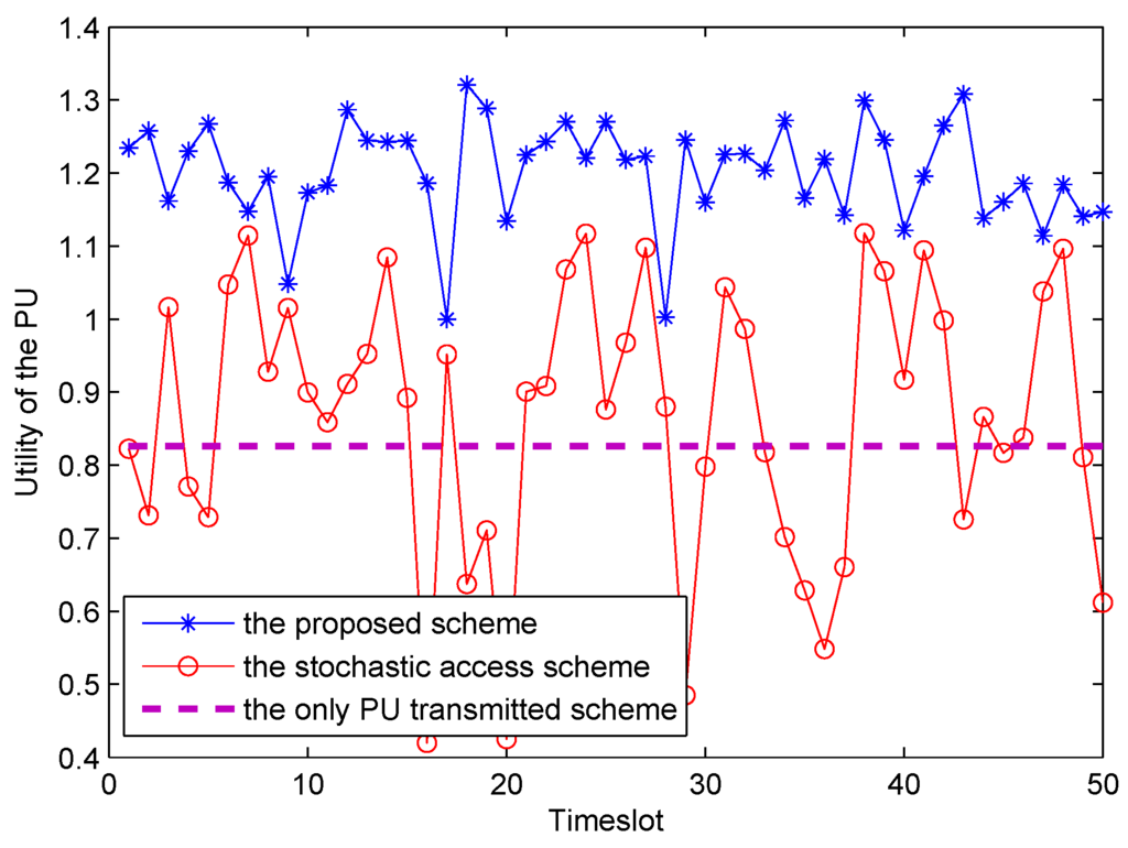 Figure 8 shows the utility of the PU with respect to different X in the corresponding time-slot for different access schemes. As shown in Figure 8, it is obvious that utility of our proposed spectrum leasing scheme outperforms that of the stochastic access scheme to a large extent. In the stochastic access scheme, the follows a Poisson distribution. Due to the monopolizing on the entire frame by PU in the only PU transmitted scheme, the energy harvesting ratio is not relevant to utility of the PU. Therefore, the utility of PU is identically equals to 0.826. In conclusion, this is the reason why the PU is willing to rent a fraction of time slot to the SU.