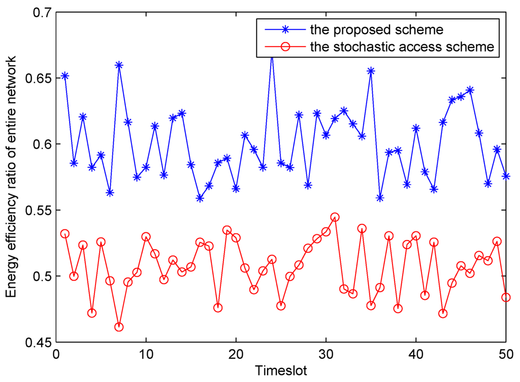 We also compared the energy efficiency ratio of our proposed energy harvesting mode based on optimal leasing time with that of stochastic access. The simulation results (50 time-slot energy efficiency ratio traces) with different probability distributions of energy harvesting ratio X are depicted in Figure 9, apparently, it can be seen that energy utilization rate of our proposed scheme is higher than that of stochastic scheme. Overall, obvious superiority and viability of the proposed scheme in this paper have been confirmed.