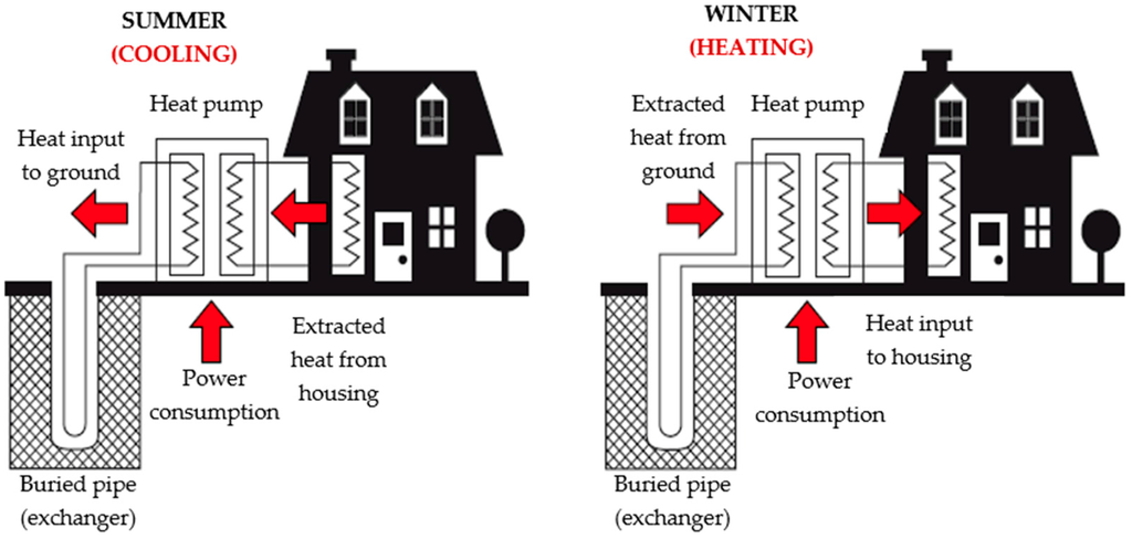 Geothermal energy is called very low enthalpy (very low enthalpy geothermal energy, VLEGE) when the heat transfer from the ground occurs at low depth and low temperature (usually less than 40 °C) []. To exploit effectively the heat capacity of the ground, a heat-exchanger system has to be constructed []. In practice, heat exchange is performed by internal fluid flowing through a collector (buried pipe), which is usually water, glycol water or even air. The geothermal exchange can be performed through a heat pump [], whereupon the internal and external circuits of the building become independent (see Figure 1), or directly by circulating the geothermal fluid through the network building’s HVAC (heating, ventilating, and air conditioning) by floor heating, radiators or air outlets for example.