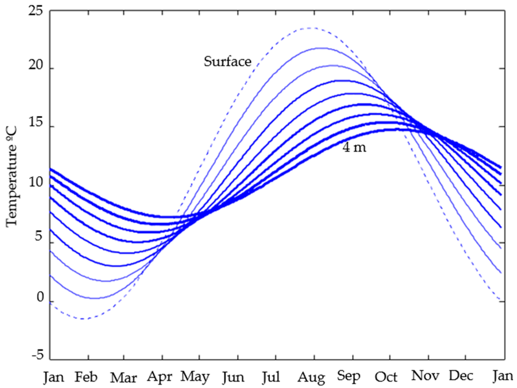 Figure 12 shows for the same time period the average daily temperatures at different depths (from 1 m to 4.8 m). Notice the sinusoidal profile as we have explained in Section 2 of this paper and how just 4.80 m deep, soil temperature is close all year to the annual average temperature in the place (19.9 °C). Note also the timing difference (phase shift) between sinusoidal functions which is due to the soil thermal inertia. This is also applicable to Figure 11 in the sense that the behavior of a surface average monthly temperature does not correspond with that expected for this month as the depth increases.