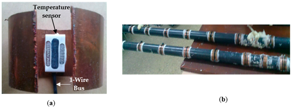 The 24 TS are connected via 1-wire bus (see Figure 4 and Figure 5a). This is a low-cost bus for digital communication over twisted-pair cable with 1-wire components. As each TS has a unique 64-bit serial code, it is possible to connect multiple TS to the same 1-wire bus quickly, simply and very cheaply. Using the code from each TS, its temperature measurement can be addressed from a PC or microcontroller board. The 1-wire bus is not a bus designed to operate in industrial environments (where noise can be an important factor to consider) because it is not differential. In [] it is shown as providing robustness to the 1-wire bus and how to connect the TS to the bus.
