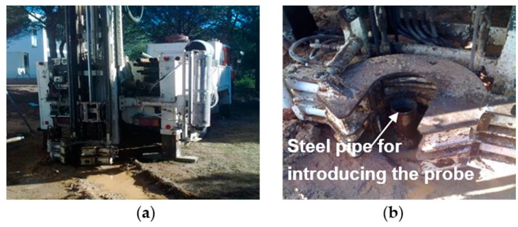 The chalet construction work has served as a real laboratory for about a year. In Figure 9a geotechnical drilling machine that was also exploited to make the drill through which the probe was introduced into a steel pipe (Figure 9b) is shown. Then, once the probe was placed in its final position, the steel pipe was removed. Later the holes between the probe and the ground were filled and compacted carefully. Finally the perimeter was watered abundantly, in order to favor the GTP contact with the ground along its whole length. The measurement campaign began when this artificial humidity was dissipated, several days later.