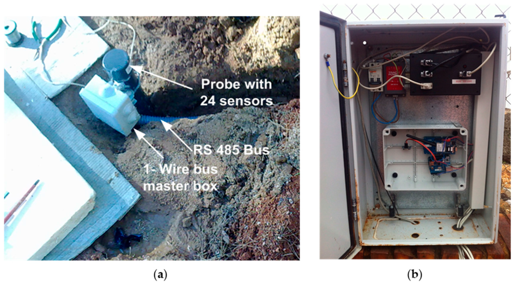 The initial end of the probe, once buried, remains outside (see Figure 10a). The 1-wire bus that picks up signals from the 24 TS (see Figure 4 and Figure 5) goes from the GTP to a waterproof box (protection category IP 65) which houses the 1-wire bus master. From here the RS 485 bus goes to another larger size waterproof box which houses the remaining elements of Figure 4 (see Figure 10b).