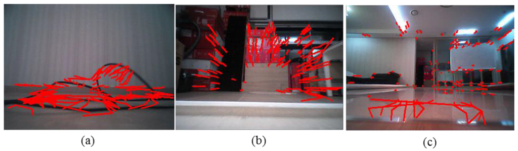 As mentioned above, most of the prior works are based on point tracking. The point tracking-based methods suffer from the problem of false correspondence and require robust features to be tracked. However, for low-mounted cameras, point tracking near the floor becomes extremely difficult because the affine motion model, which is assumed by most of the algorithms, becomes invalid. Figure 1 shows the point tracking results of five sequential real indoor environment images when the camera moves forward with no rotational motion. The images are captured from a camera mounted at 6.3 cm above ground. For tracking, we use the pyramidal implementation of LKT scheme [25] employed by most previous works. A tangled wire case is shown in Figure 1a. Most of the tracked features are clearly false correspondences. A windowsill case is shown in Figure 1b. No tracked features appear in the windowsill region, which is the actual region of interest. Figure 1c shows a nonobstacle case where the floor appearance changes as a function of robot motion. The tracked features of the floor region clearly include false correspondences. These erroneous tracking results induce large homography errors and eventually lead to false positives. For robotic vacuums, false positives in obstacle detection mean poor cleaning performance.