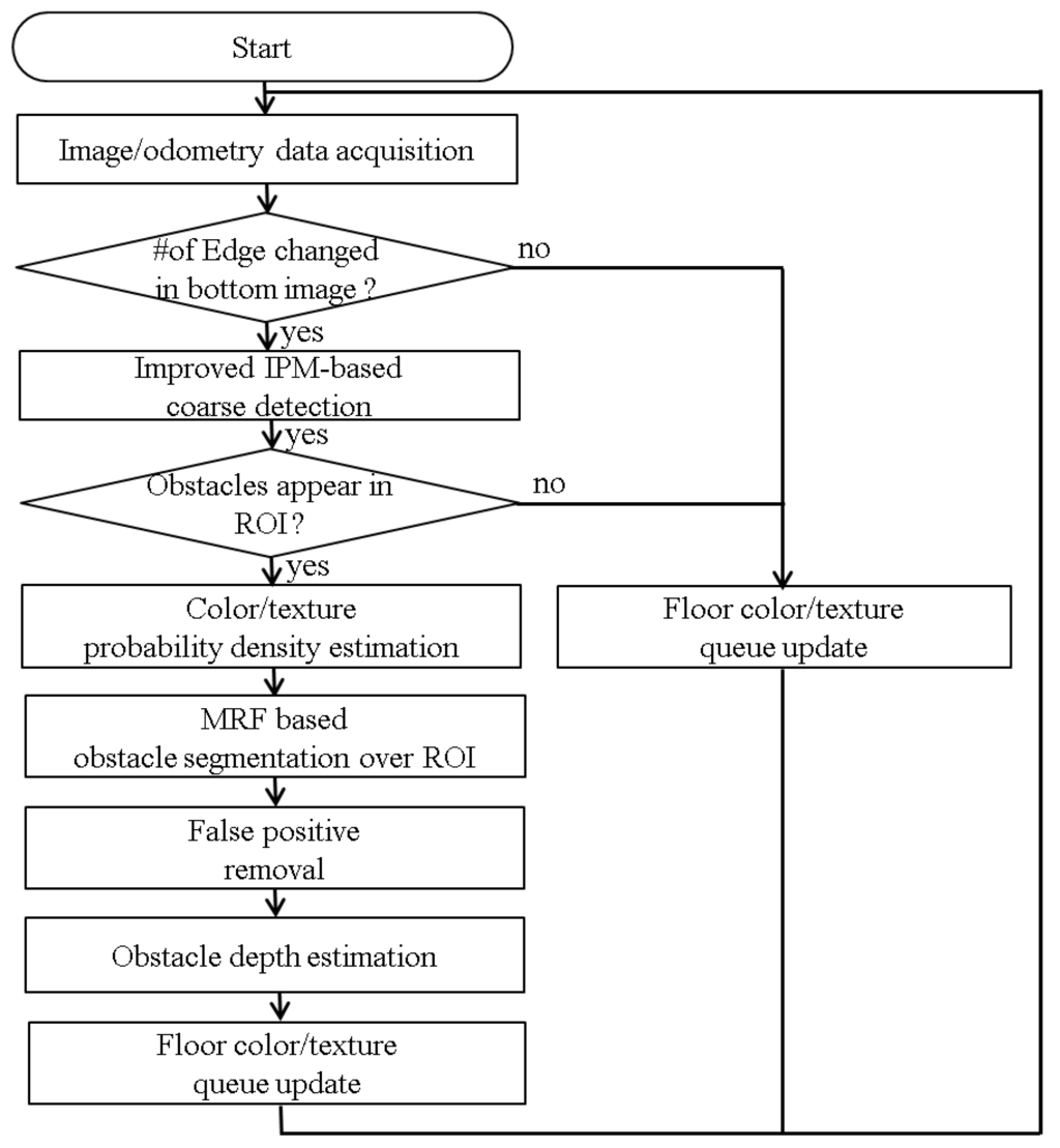 In contrast, vision-based systems provide rich information about the environment and have become promising alternatives, especially considering the current availability of low-cost image sensors and high-performance processors. Of the various vision-based approaches, monocular vision-based approaches are the most suitable for various reasons such as low cost, light weight, and short processing times. This work thus presents a monocular vision-based obstacle detection method. The goal of this research is to detect various types of low obstacles that are difficult to distinguish from the floor. Especially, this work focuses on the situation where the camera is low above the floor. In various robot platforms such as robotic vacuums or small monitoring robots, the camera cannot be installed high above the floor. In this case, extracting cues for distinguishing between the floor and obstacle regions in an image from a conventional point tracking method becomes extremely difficult. The detailed situation when the camera is low above the floor is analyzed in Section 2. In addition, we focus on minimizing the false positives related to nonobstacle images.