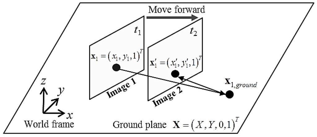 Figure 4 illustrates the geometrical properties of the camera image plane along with the corresponding transformed plane on the ground. A robot acquires images 1 and 2 at two different times t1 and t2, respectively, and can apply the relative transformation by using the odometry information between the two frames. Assume that pixel x1 in image 1 belongs to the floor. Then x1 can be projected to the floor as x1,ground, and then reprojected to image 2 as x’. This can be simplified as follows by using the floor homography matrix H: