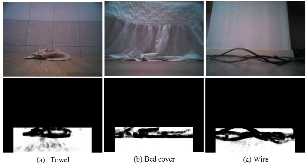 For the experiments, the following obstacles were selected: a wire, a fan, a speaker with a thin plate at the bottom, a chair with U-shaped legs, a four-legged chair, a bed cover, a window sill, a unicolor transformer, a unicolor toolbox, and a garment. We also tested four different nonobstacle cases where the floor changes appearance depending on the robot motion as follows: a floor material changes from marble to laminate and vice versa, a carpet changes from gray to pink, and a black A4-size paper lies on the floor. In this case the algorithm must be sufficiently robust to distinguish between the obstacle and any changes in floor appearance.