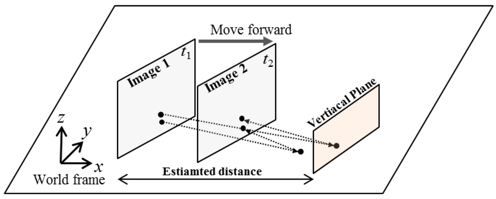 The previous section introduces the method for estimating the distance between the candidate obstacle and the robot. Next, the estimated distance is transformed with respect to the first frame, and a virtual vertical plane is set up. Figure 9 illustrates the geometrical properties of the camera image plane and the corresponding vertical plane. We assume that the obstacle can be modeled as a vertical plane. We calculate two homography matrixes: a floor homography matrix and the homography matrix of the obstacle’s vertical plane. By using these two homography models, the virtual image is calculated as done in the IPM method. The interpretation of this virtual image is that the world is composed of a floor and a vertical obstacle plane in front of the camera.
