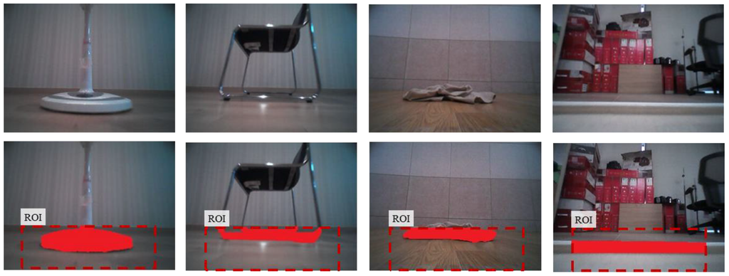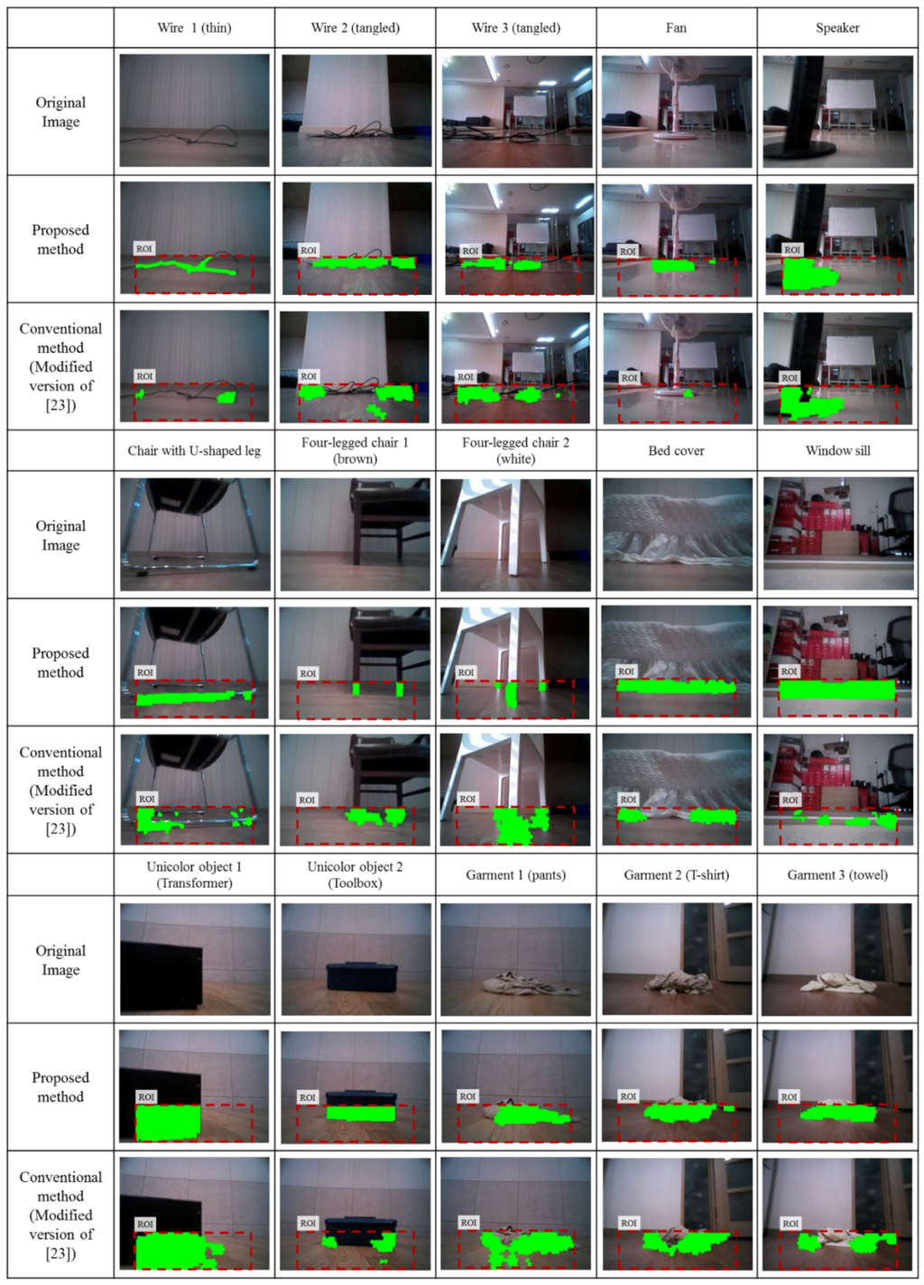 Figure 14 shows the results of nonobstacle cases from the 20 datasets of four scenarios. The first row shows the original image and the second and third rows show the results obtained with the proposed method and with the conventional method (a modified version of the method used in [23]). The false positive rate of the result is shown in Table 2. The proposed method has a false positive rate of zero whereas the conventional method has a false positive rate of 17.6%. As mentioned in the introduction, the most serious problem of a high false positive rate for a robotic vacuum is that the robot regards the false positives as obstacles, which may result in poor cleaning. However, the proposed method efficiently differentiates between these cases by using the IPM method and proper thresholding.