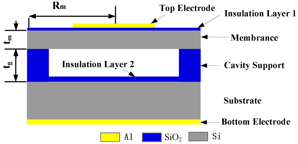 where E, , , , , represent the Young’s modulus, the density of membrane, the density of liquid, the Poisson’s ratio, the thickness of the membrane, and the radius of the membrane, respectively. High-resistivity silicon was chosen as the membrane material. From previous finite element software ANSYS analysis [19,20], following Equation (1), and .