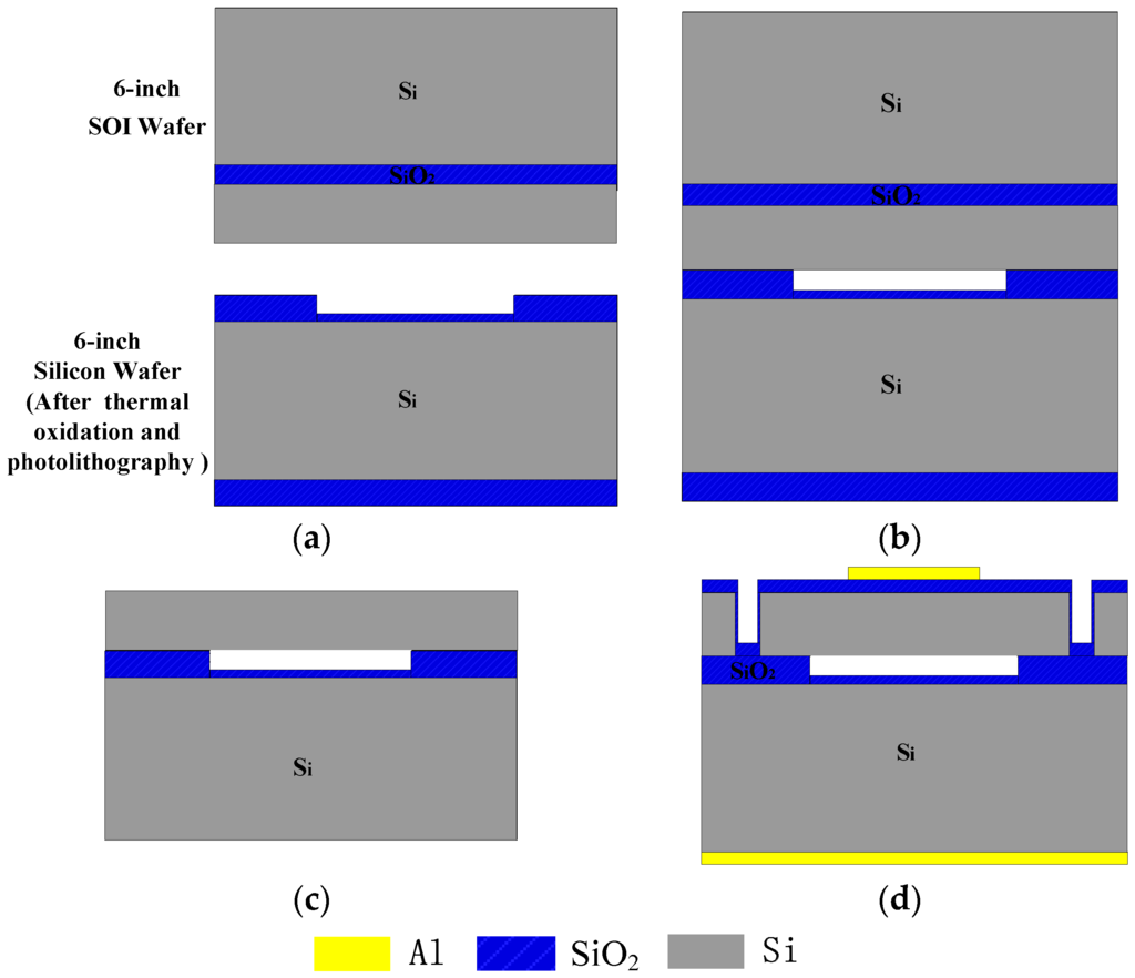 The main fabrication flow-charts. (a) part etched to form cavities; (b) bonding; (c) form membrane; (d) form isolation channel, insulation layer and electrodes.