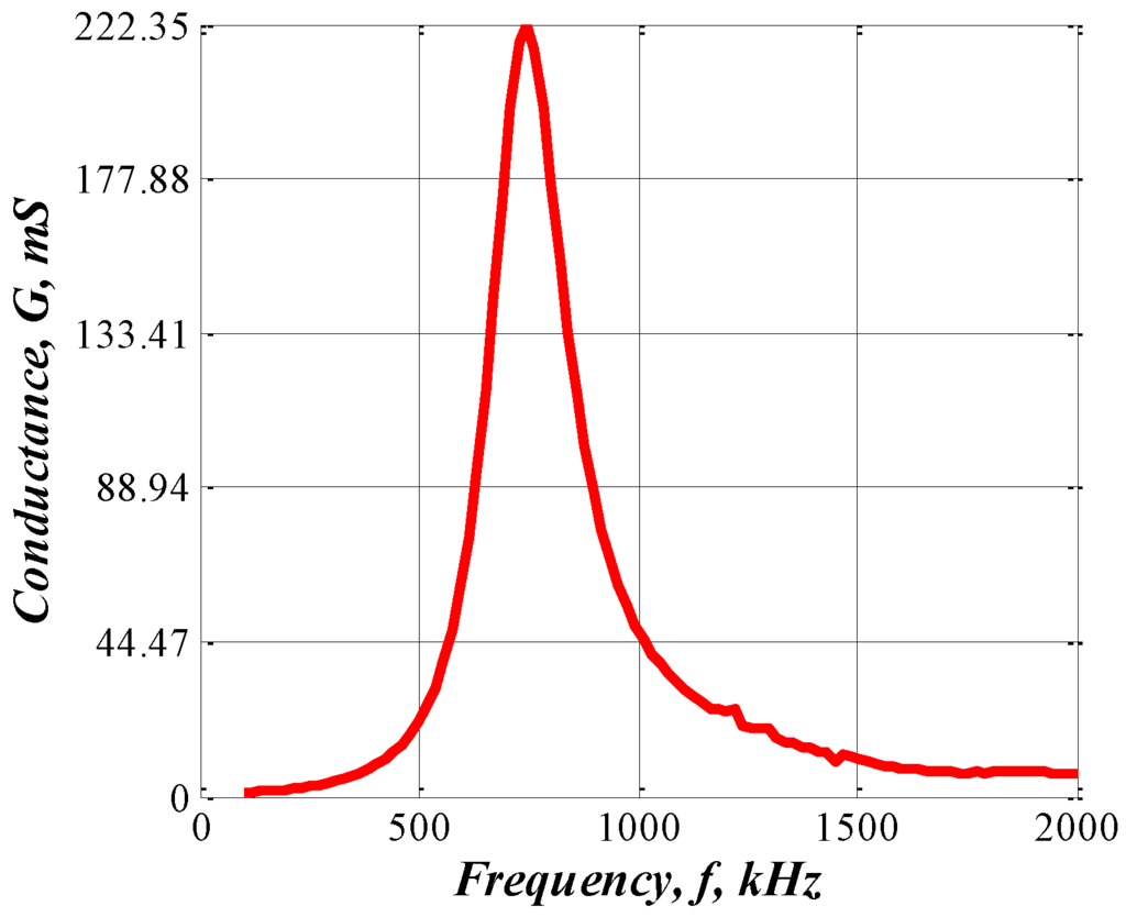 The CMUT resonant frequency was found as shown in Figure 4. The linear array was encapsulated for insulation from the water [21], and a precision impedance analyzer (Agilent 4294A, Agilent Technologies, Santa Clara, CA, United States) was used to measure the array impedance in water (underwater penetration 0.45 m, water temperature 13 °C). The CMUT resonant frequency = 700 kHz, and electric conductance = 222.35 mS. The CMUT transmission characteristics (transmitting voltage response and directivity) were analyzed over the frequency range of interest (100–1000 kHz).