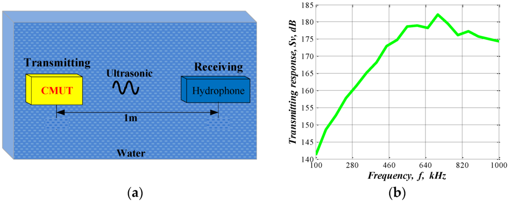 where l is the distance between the two transducers, is the applied driving voltage of the transmitting CMUT, is the collected voltage standard hydrophone, and is the receiving sensitivity of the hydrophone, the CMUT transmitting voltage response was obtained at different frequencies, as shown Figure 5b. The 1 × 16 CMUT linear array has resonant frequency 700 kHz, and pressure amplitude of 182 dB () at 1 m for underwater applications.
