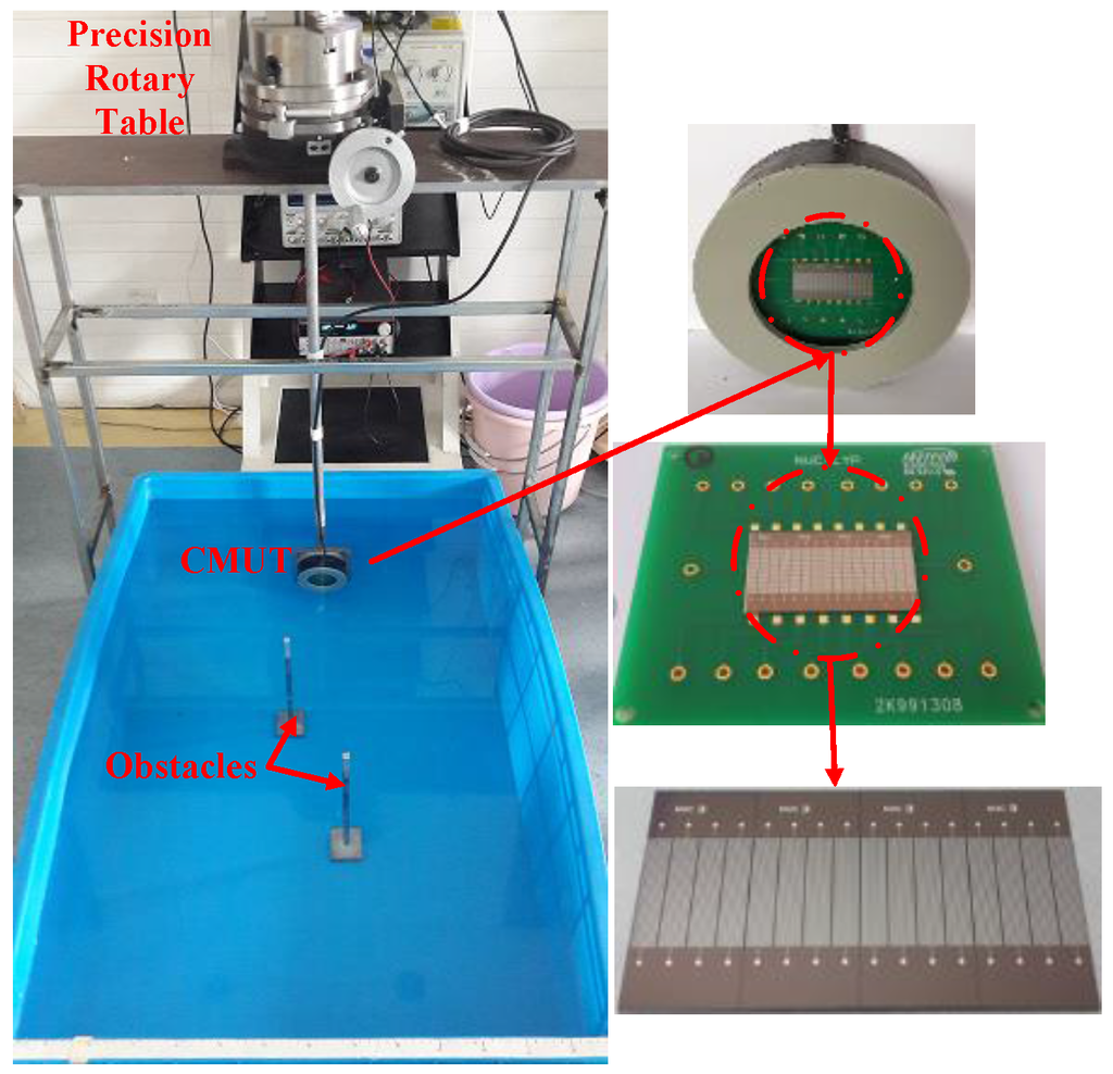 The sector scanning experimental setup is shown in Figure 6. The operating conditions of the CMUT array were the same as previously, except it was now excited with a burst signal at 700 kHz for two cycles. The receiving and transmitting array was fixed on a precision rotary table and rotated to implement sector scanning for two-obstacle imaging.