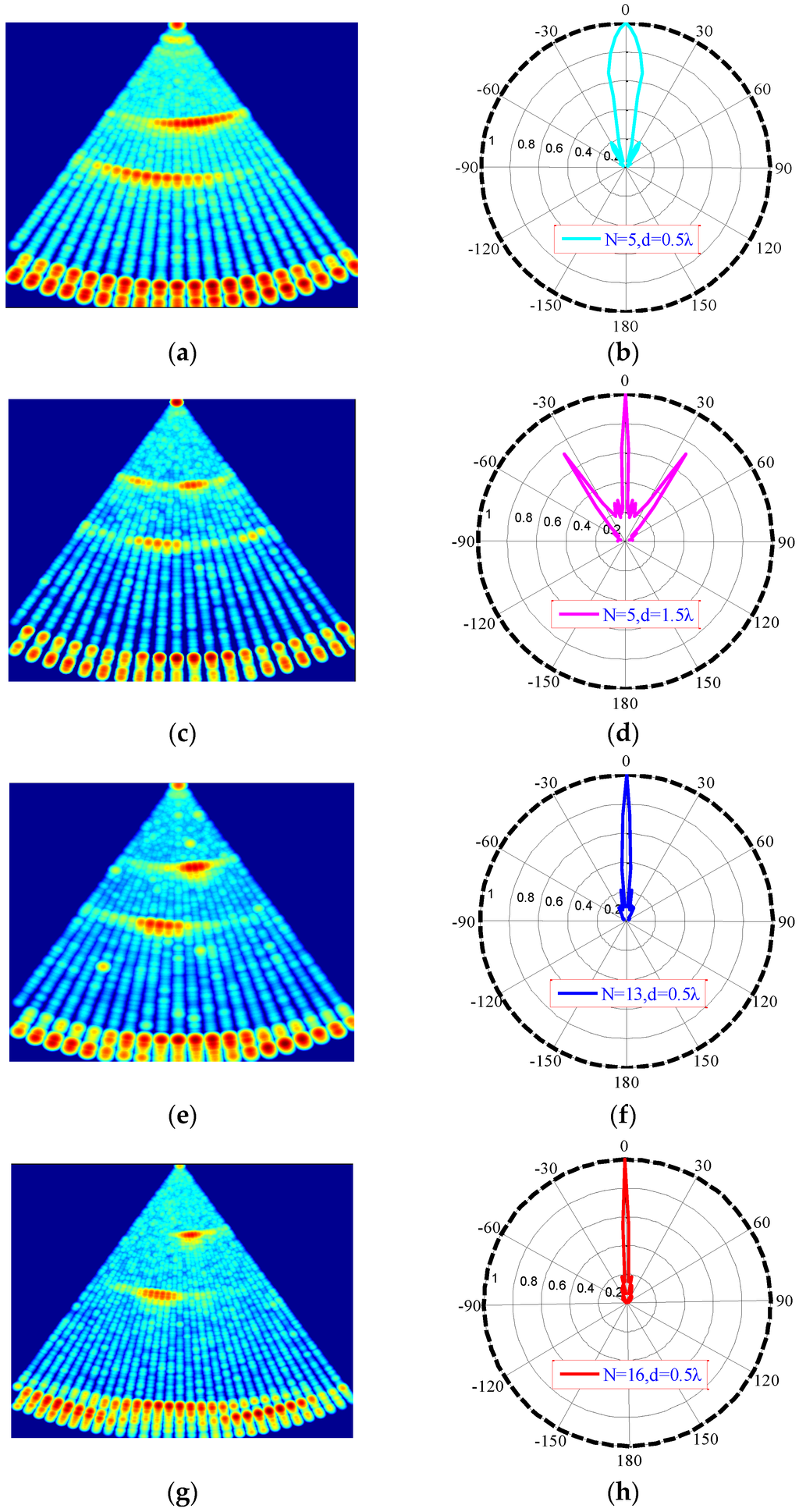 Figure 7 shows the S-scan results and corresponding directivity diagrams for four transmitting conditions Figure 7b,d,f,h, where N is the number of array elements, d is the element spacing between array elements, and λ is the wavelength. The −3 dB main beam width of Figure 7b,d,f,h are approximately 21°, 6.4°, 8°, and 5°, respectively.
