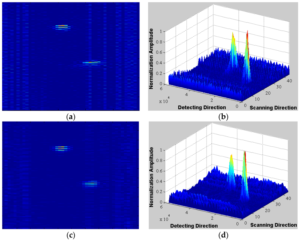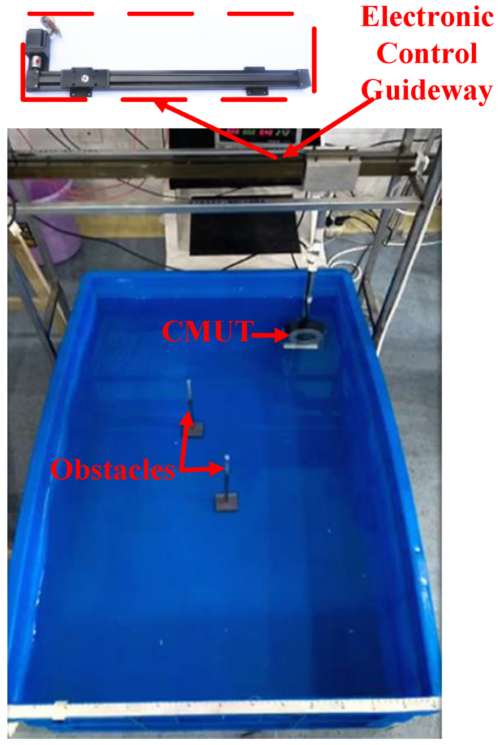 Figure 8 shows the SAFT experimental setup. The operating conditions of the CMUT linear array were the same as for Section 3. The CMUT array was fixed on the electronic control guideway and moved horizontally to implement linear scanning for two-obstacle imaging. 16 elements were simultaneously excited. Figure 9 shows the SAFT reconstructed image (Figure 9a,b) is a significant improvement over traditional B-scan (Figure 9c,d), and artifacts caused by side lobes are effectively suppressed. Thus, the proposed array greatly reduces transmission issues without requiring phased transmission, thereby improving lateral resolution, which will be of great benefit in underwater imaging.