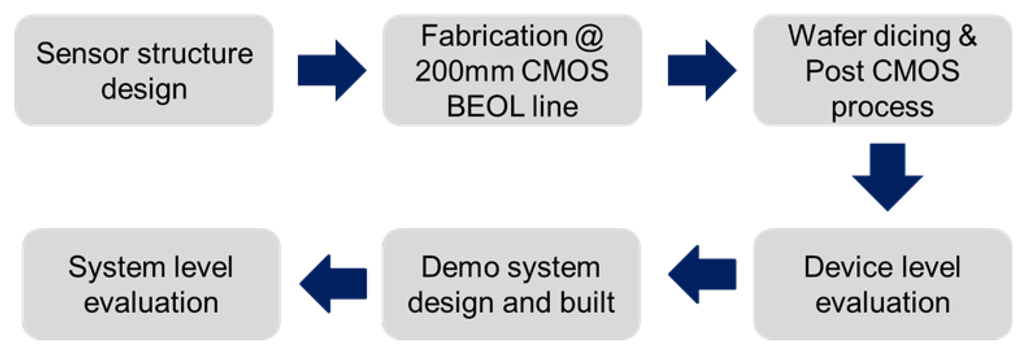 Figure 1 shows the whole workflow of this study. Firstly, The CMOS compatible capacitive sensor structure was designed and fabricated on a 200 mm CMOS BEOL line. After that, the wafer dicing was done, and the sensor was fabricated by filling GO material in this structure. Finally the prototype humidity sensor was designed and built to evaluate its performance.