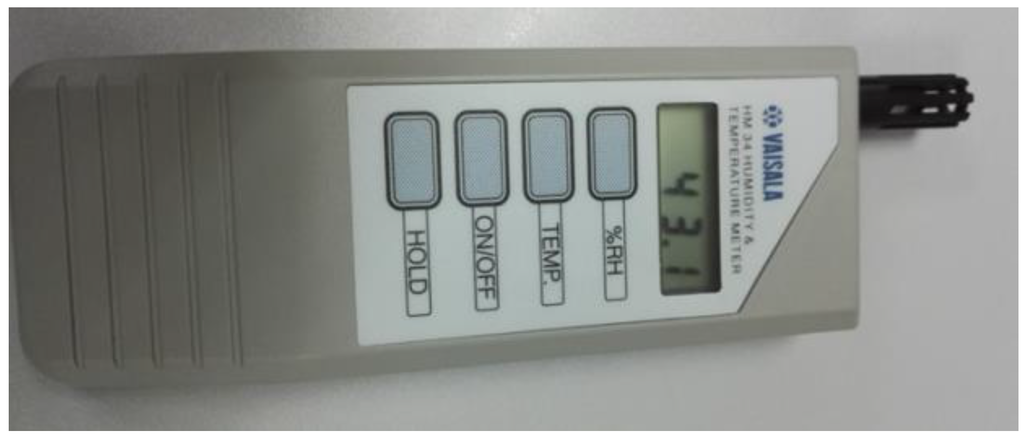 A prototype humidity sensor was designed and built by integrating the sensor with a dedicated readout ASIC and display/calibration module at the PCB level. A standard frequency-voltage convertor (CAV444, Analog Microelectronics, Mainz, Germany) was used as readout circuit to extract the capacitance variation by the RC oscillation mechanism. The prototype sensor was then evaluated in different environments, and all the measured data was compared with a standard humidity sensor (HM 34 Humidity & Temperature Meter, VAISALA, Vantaa, Finland) as shown in Figure 3.