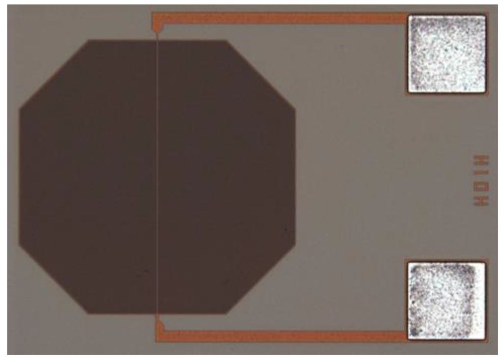 A standard 0.35 μm CMOS BEOL process was used to fabricate the comb/serpent capacitor structure. A BEOL Al metal layer was used as capacitor electrode with line/space/height = 0.78 μm/0.54 μm/0.8 μm. The structure was designed with consideration of least fringing field and parasitic capacitance, and PAD was formed by the same metal layer. A top-view photo of the structure can be seen in Figure 5, in which the sensor structure was located on the left, with dimensions of about 500 μm × 500 μm and the bonding PAD was on the right with dimensions of 150 μm × 150 μm.