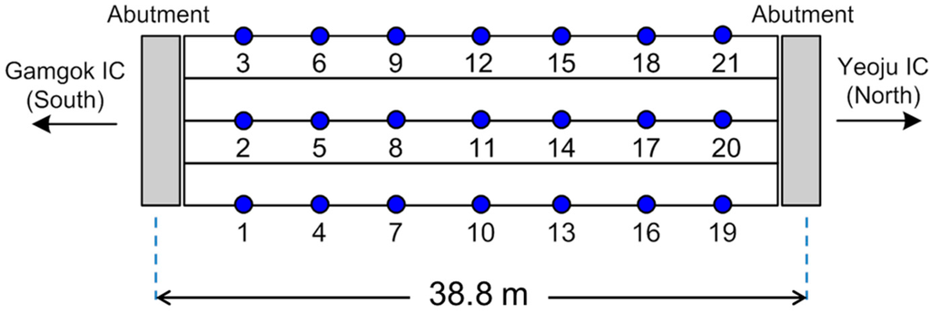The initial FE model of Samseung Bridge was updated in Yi et al. [13] based on the ambient vibration measurements. A series of ambient vibration tests were carried out on the bridge in four different seasons: (1) August 2004; (2) December 2004; (3) July 2005; and (4) February 2006. For the ambient vibration tests, 21 accelerometers were installed on the bridge, as shown in Figure 5. The wind and traffic on the adjacent bridge were the main vibration sources during the ambient vibration tests. Ambient vibrations were measured for 30 min at a sampling frequency of 200 Hz. A low-pass filter with a cut-off frequency of 90 Hz was utilized to avoid aliasing. To validate the result of the FE model updating, loading tests with varying truck weights and speeds were carried out after each ambient vibration test. The measured deflections by the loading trucks were compared to the simulated ones in the updated FE models to see the validity of the FE model updating. More details of the field test and FE model updating can be found in Yi et al. [13].